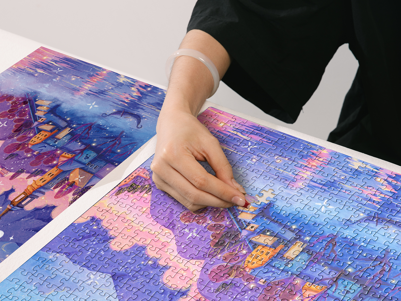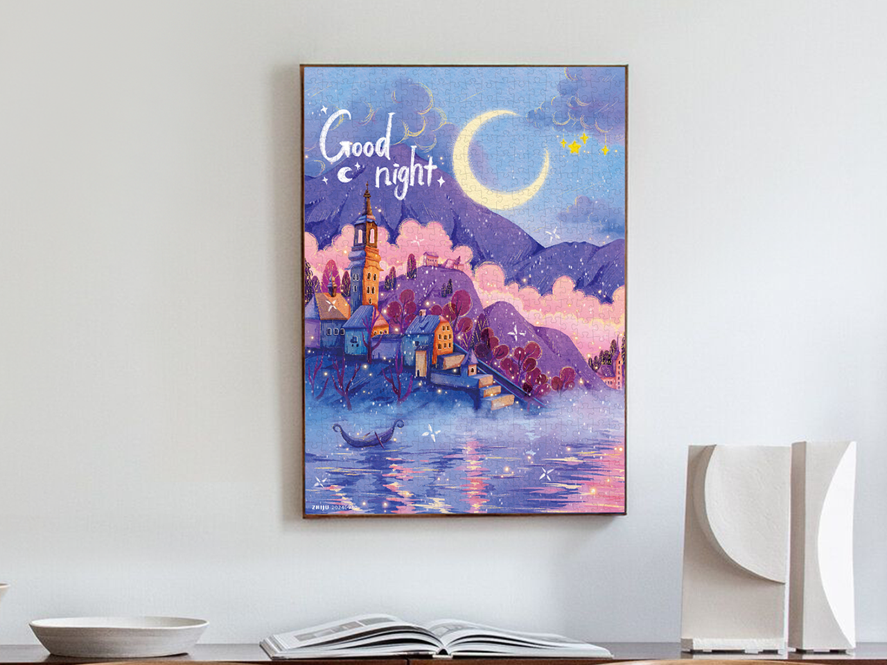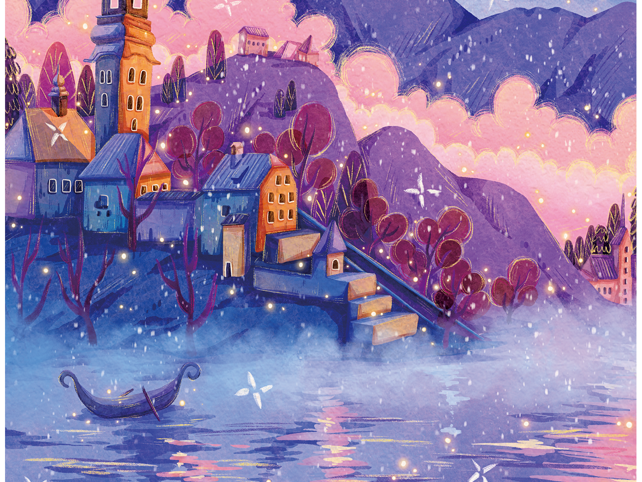 这幅画以梦幻般的笔触捕捉了斯洛文尼亚布莱德湖迷人的冬季景致。远处的连绵山峦在夜色中呈现深紫色,与近处景物共同营造出深邃的空间感。平静的湖面倒映着天空、山峦与建筑,一叶小舟静静漂浮在水面,漾起轻柔涟漪。湖面还闪烁着细碎光点,宛如夜色中起舞的精灵。