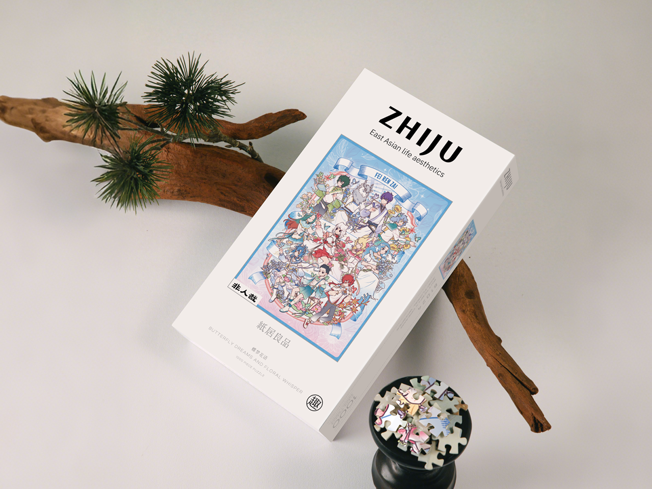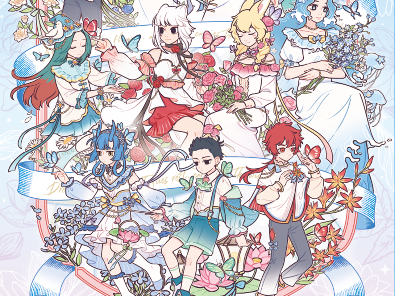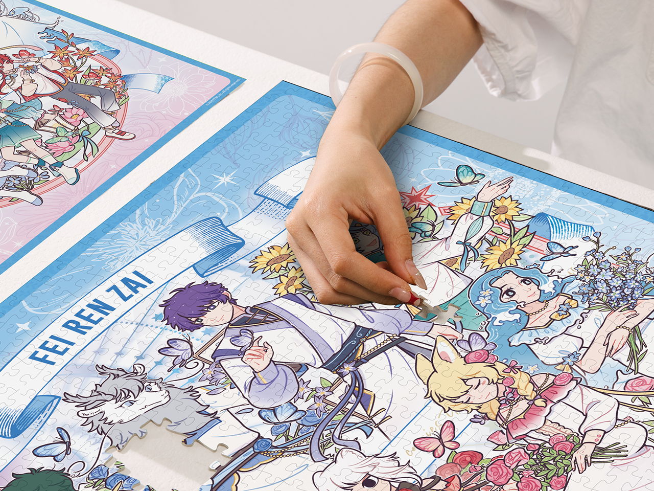 这幅拼图场景洋溢着梦幻浪漫的氛围。背景以柔和的浅蓝色为主,营造出宁静美好的意境。画面中呈现了多位《非人哉》角色,身着风格统一又各具特色的优雅服饰,主色调为白色并点缀着多彩装饰,显得清新雅致。角色周围环绕着繁茂的鲜花,包括艳丽的玫瑰与娇嫩的雏菊等。