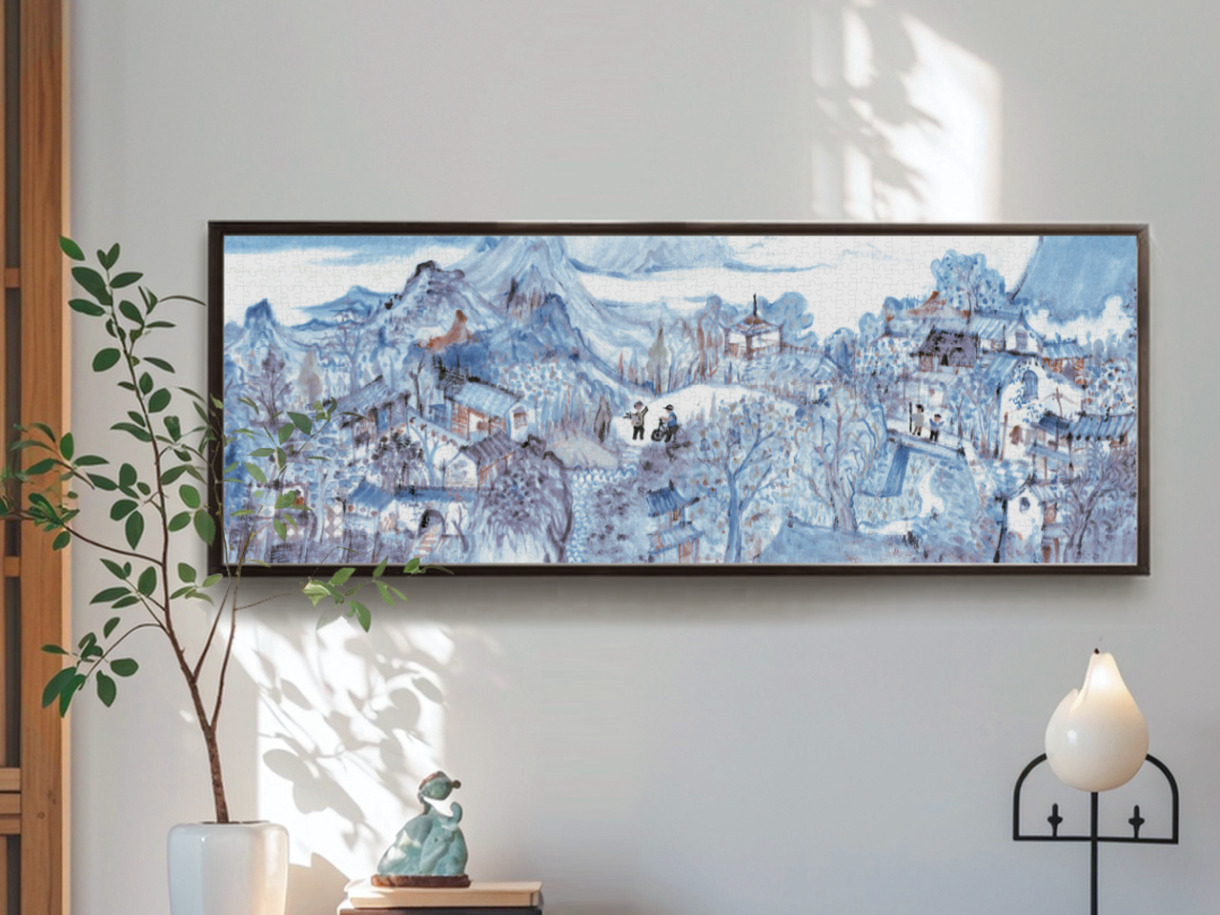 This painting uses light ink and pastel colors to delicately depict the fresh and elegant beauty of Jiangnan. In the scene, thin clouds drift lazily across the sky, casting a veil of poetic mystery over the entire landscape. Within the village, people chat or play, their expressions serene and content, embodying the leisurely pace of life. A small bridge spans the gentle flowing stream, harmoniously complementing the scattered village houses, creating a serene and harmonious rural landscape.