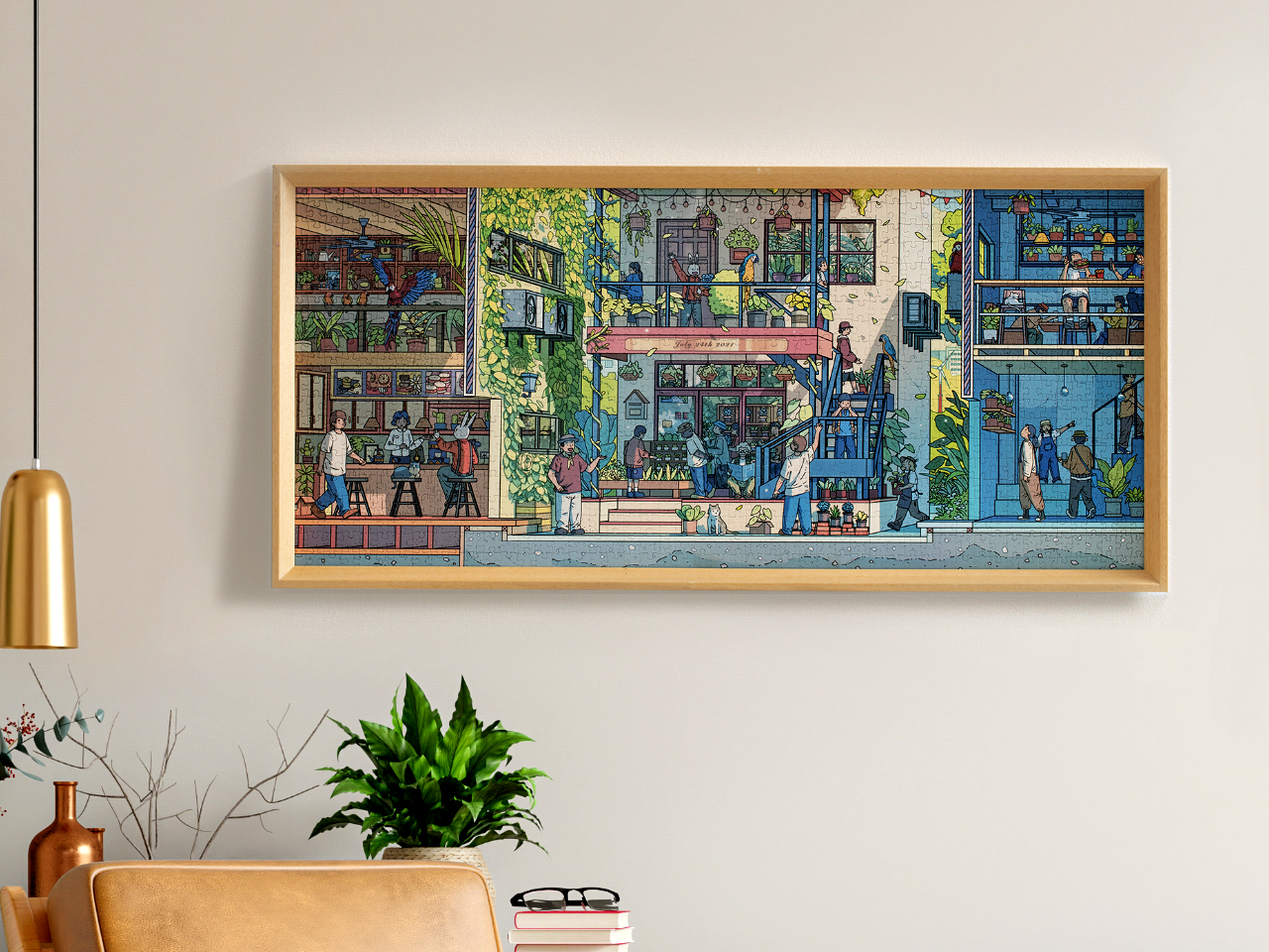 鲜艳的色彩营造出悠闲、热闹且充满活力的社区生活氛围,唤起邻里间的温暖与情谊。通过对这些愉悦日常场景的描绘,艺术家展现了人与自然、人与人之间的和谐共处。每个场景都包含着温暖动人的瞬间,犹如一部慢节奏的生活片段短片。