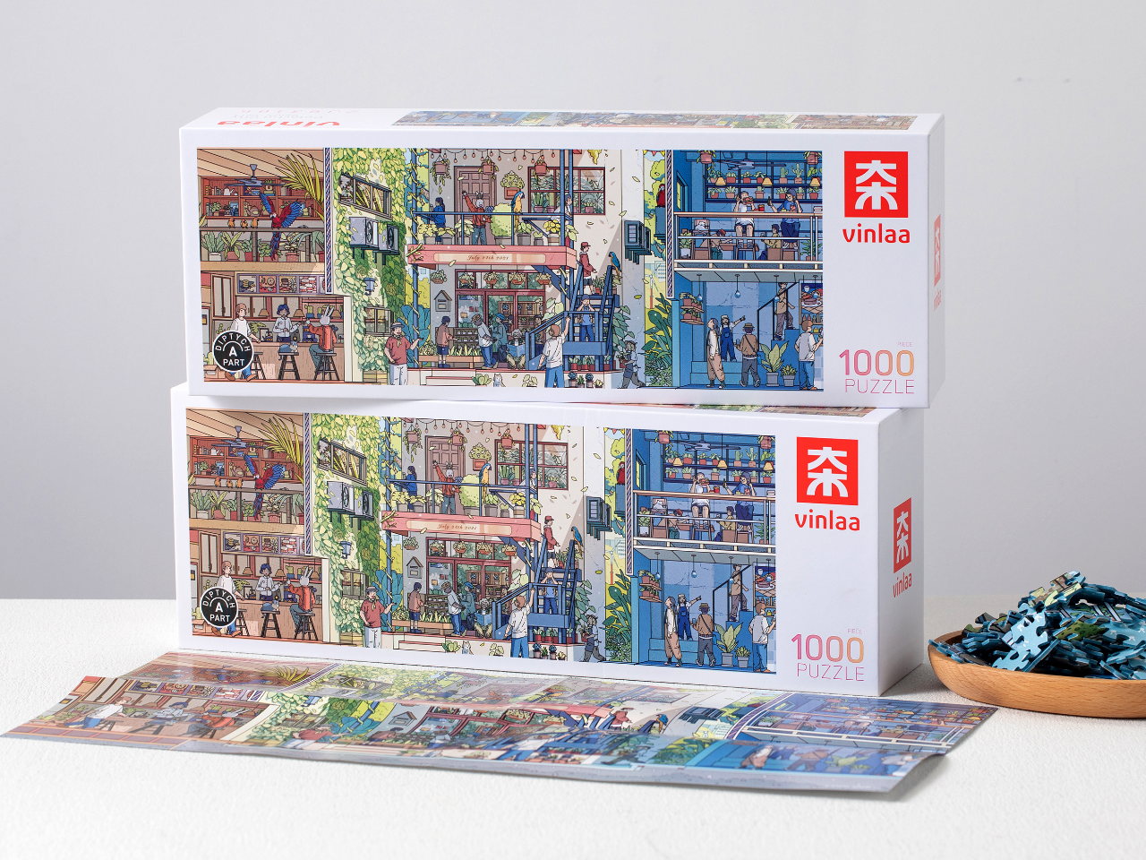当这两幅图像组合在一起时,描绘出一个充满日常生活活力的热闹街景。场景中,房屋被绿植环绕,每层楼都在进行不同的活动。沿街分布着温馨的小店,人们在此互动交谈,还有鹦鹉等小动物穿梭其间。街道上行人往来——有的在植物店浏览,有的在咖啡馆用餐,还有的在餐车旁驻足。路边还设有面包店和自动售货机,每个细节都体现出日常生活的丰富多彩。