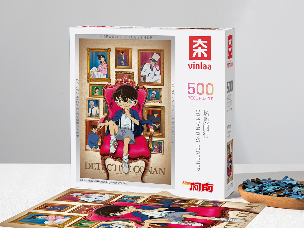 见证少年侦探团的辉煌时刻!这款官方500片拼图精心重现了柯南与伙伴们同框的经典场景。画面中央,柯南端坐在复古王座上,目光如炬,散发着洞悉真相的坚定意志。他可靠的伙伴们——安室透、毛利兰、怪盗基德与灰原哀,各自端坐在雕花王座上,无声传递着彼此间坚定不移的信任与支持。