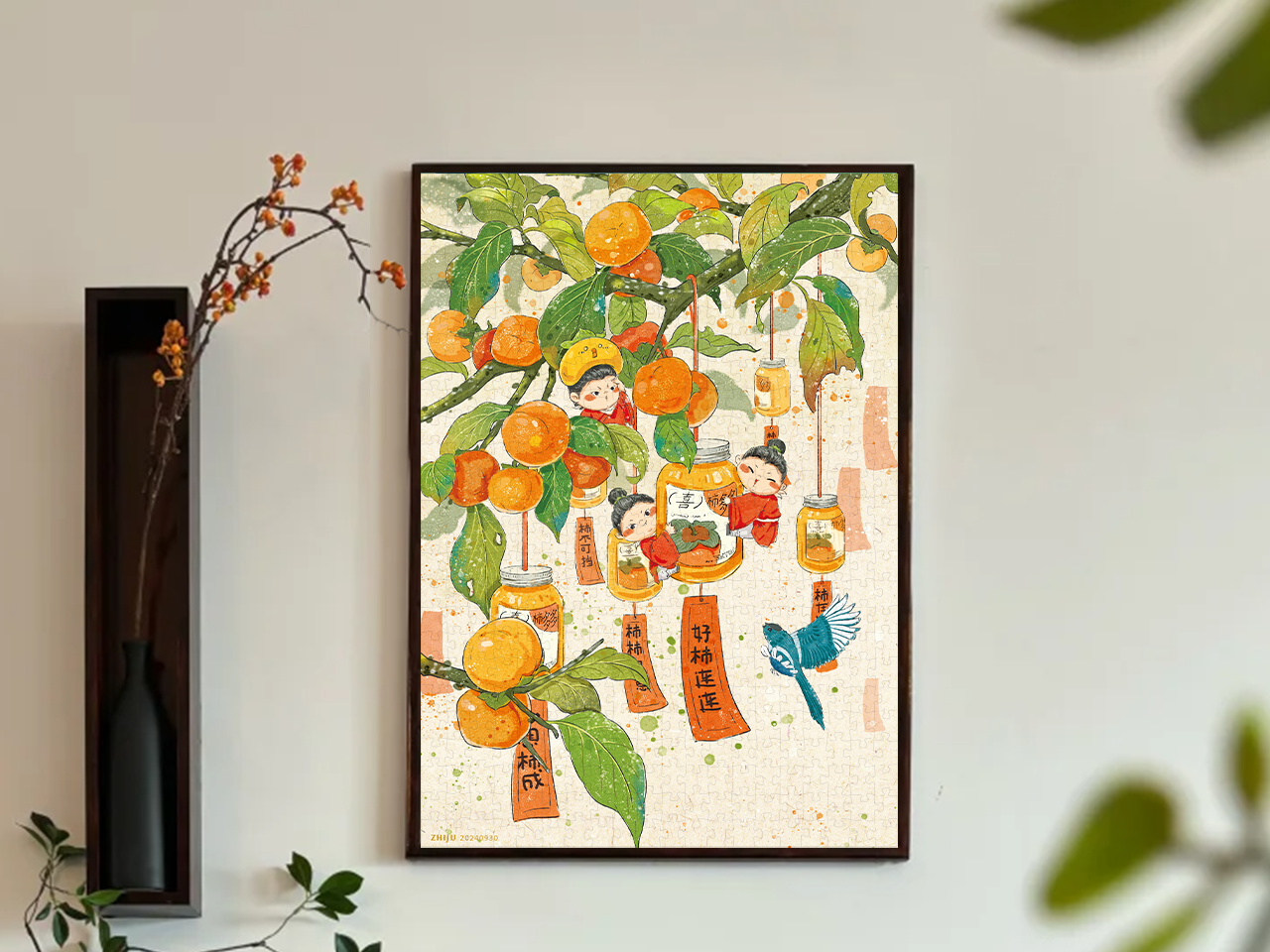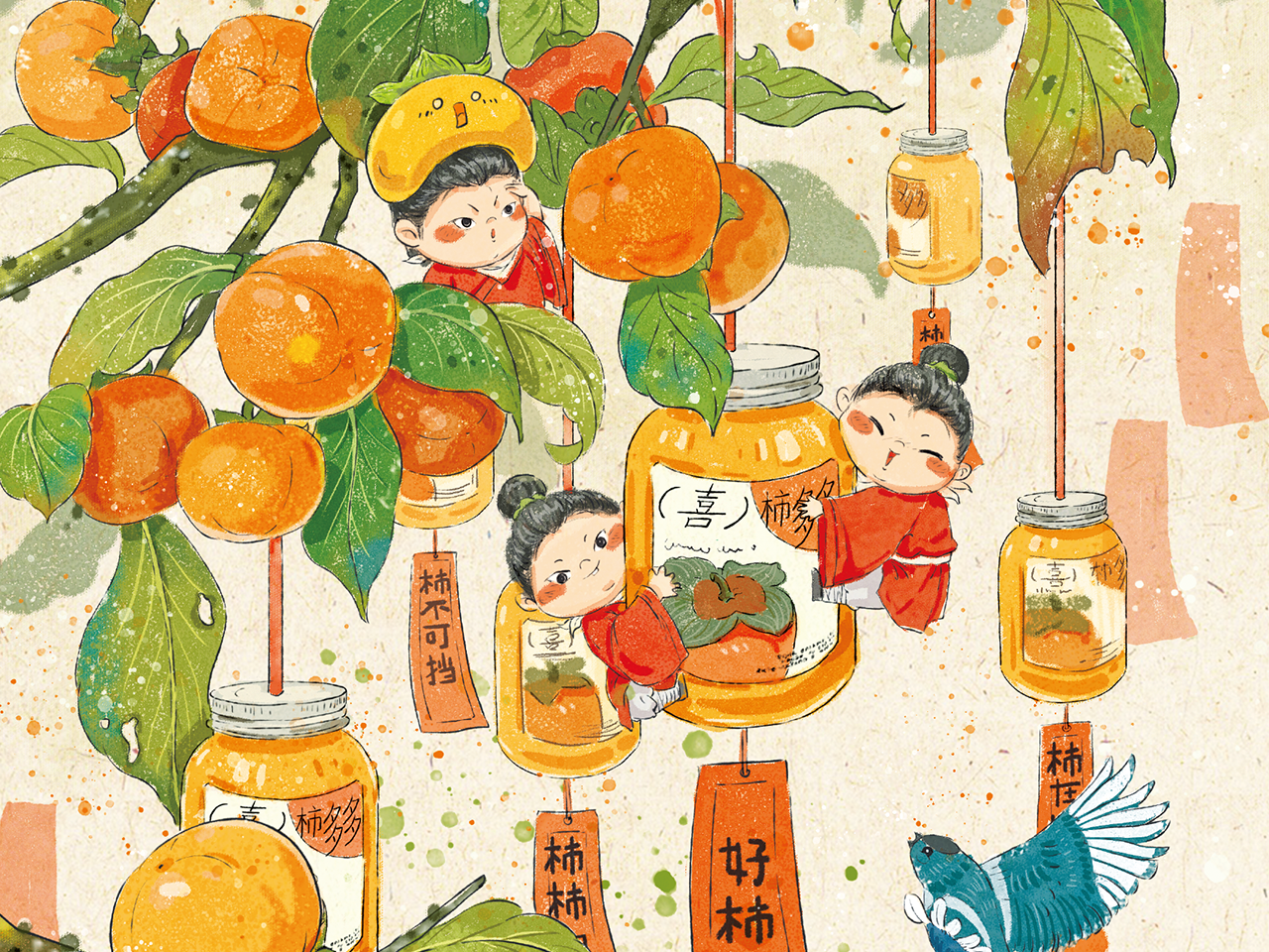 柿子在传统文化中承载着丰富的吉祥寓意。因“柿”与“事”谐音,象征万事顺遂、诸事大吉;成熟的柿子多为红色,而红色在中国代表喜庆,象征红红火火的生活;多个柿子组合寓意好事成双、喜事连连;柿子饱满的形态也象征着生活的丰盈与圆满。