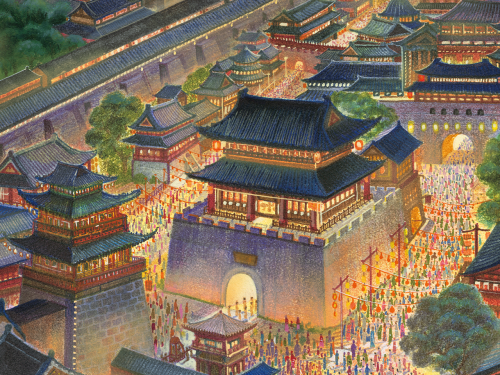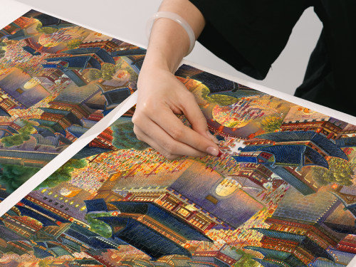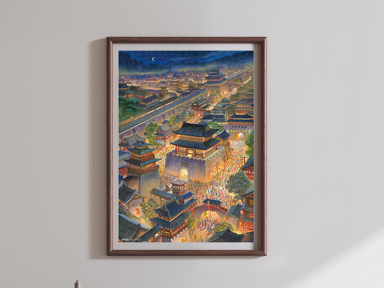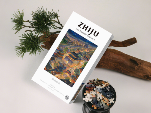 这幅拼图描绘了夜幕下的古城景象,巍峨楼阁与错落有致的民居交相辉映。街巷灯火通明,行人如织,在皎洁月光与远山映衬下,完美呈现了历史都城繁华绚丽的诗意图景,仿佛开启了一段通往盛世华年的时光隧道。