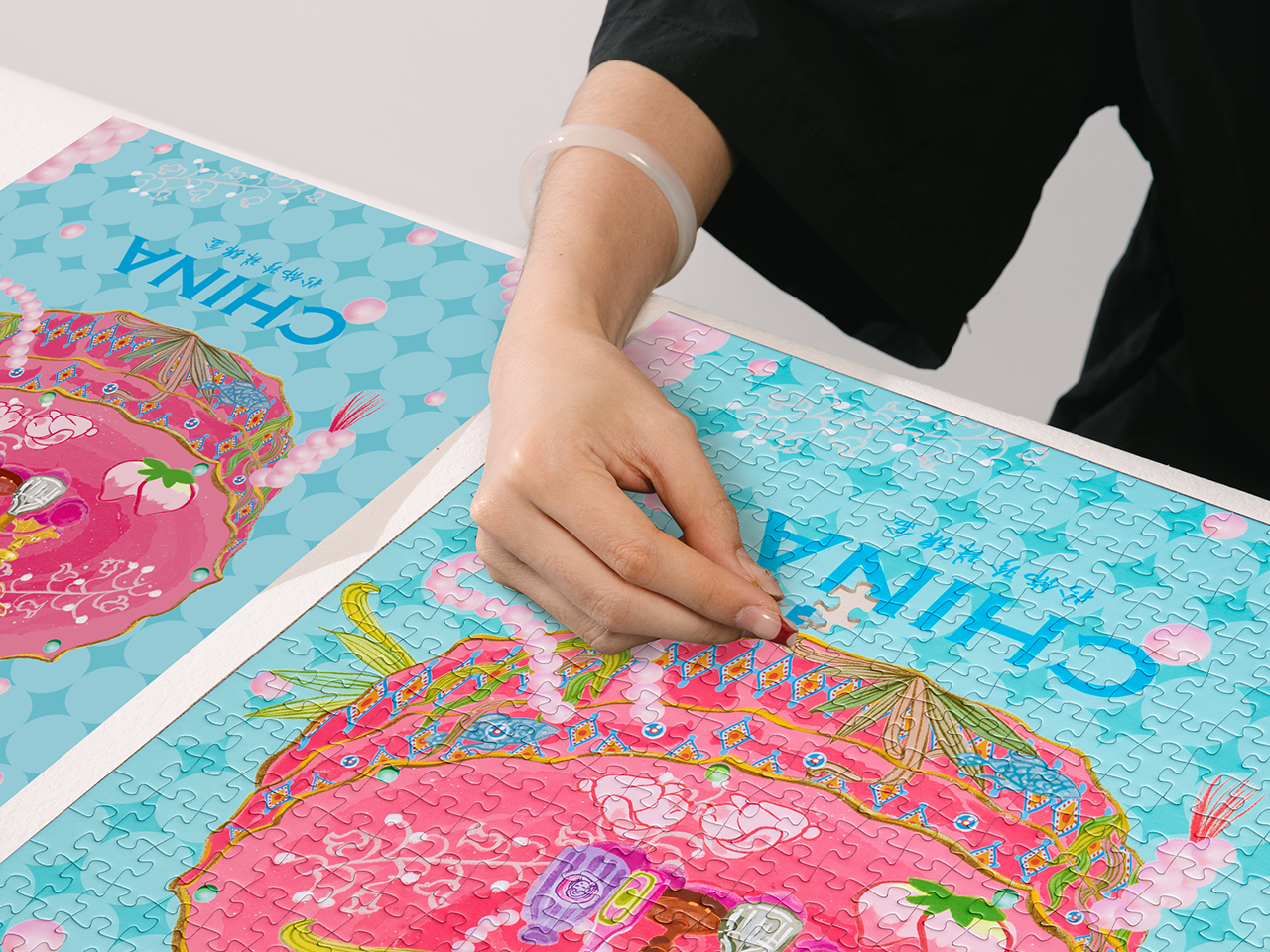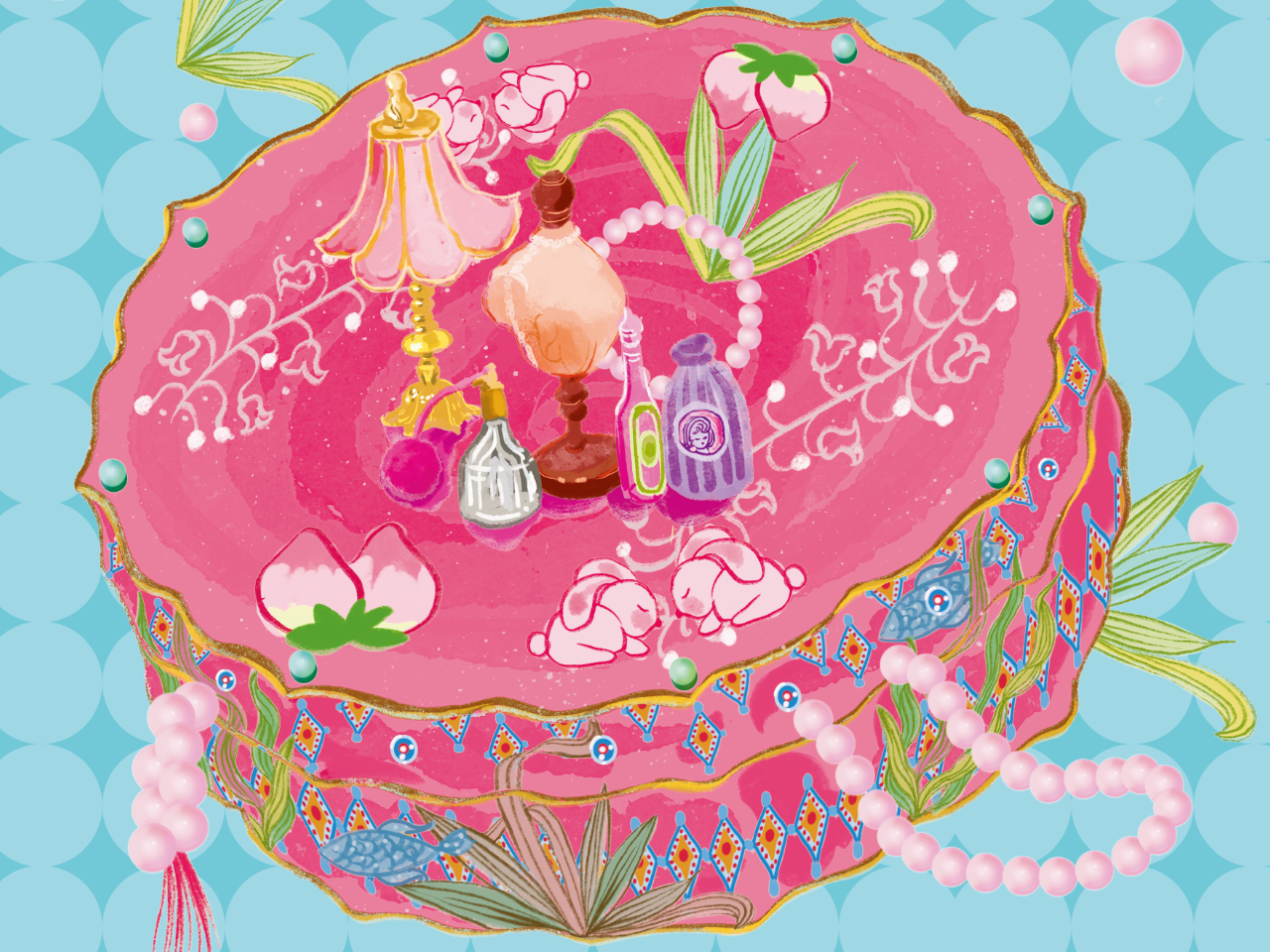 此插画描绘的原物为一件菱形盒,饰有艾叶与符咒纹样,制作于18世纪末乾隆年间。盒高2.5厘米,直径8厘米,现藏于香港中文大学博物馆。盒身施红色珐琅釉,盒盖装饰五毒图案——蜈蚣、蛇、蟾蜍、蝎子与蜘蛛,其间点缀莲花、艾草、桃实、荸荠及藕节。