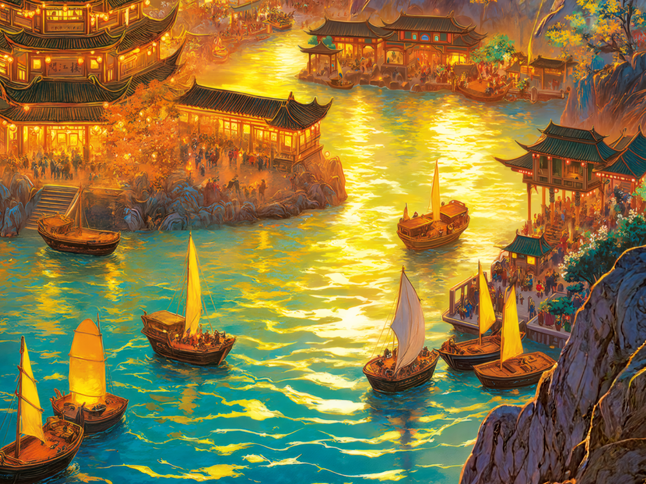 这幅画呈现出奇幻瑰丽的山水盛景。画面以暖色调为主,夕阳余晖洒在连绵山峦,金黄、橙红、靛紫交织,将山峰晕染得层次丰富。山间湖泊如镜面,倒映着天光山色,波光粼粼。 湖畔,中式楼阁错落有致,飞檐翘角,灯火辉煌,热闹非凡。楼阁前的平台上,人群熙攘,似在观赏夜景、参与活动。水面上,数艘帆船摇曳,船帆颜色各异,有的还亮着灯,为静谧湖面增添灵动。 远处山峦与天空交融,霞光漫溢,营造出宏大而浪漫的氛围。整幅画将山水之美与人文烟火气结合,色彩绚烂,细节丰富,仿佛把观者带入一个繁华又梦幻的世外仙境,感受自然与人文交融的独特魅力,传递出祥和、热闹的气息 。