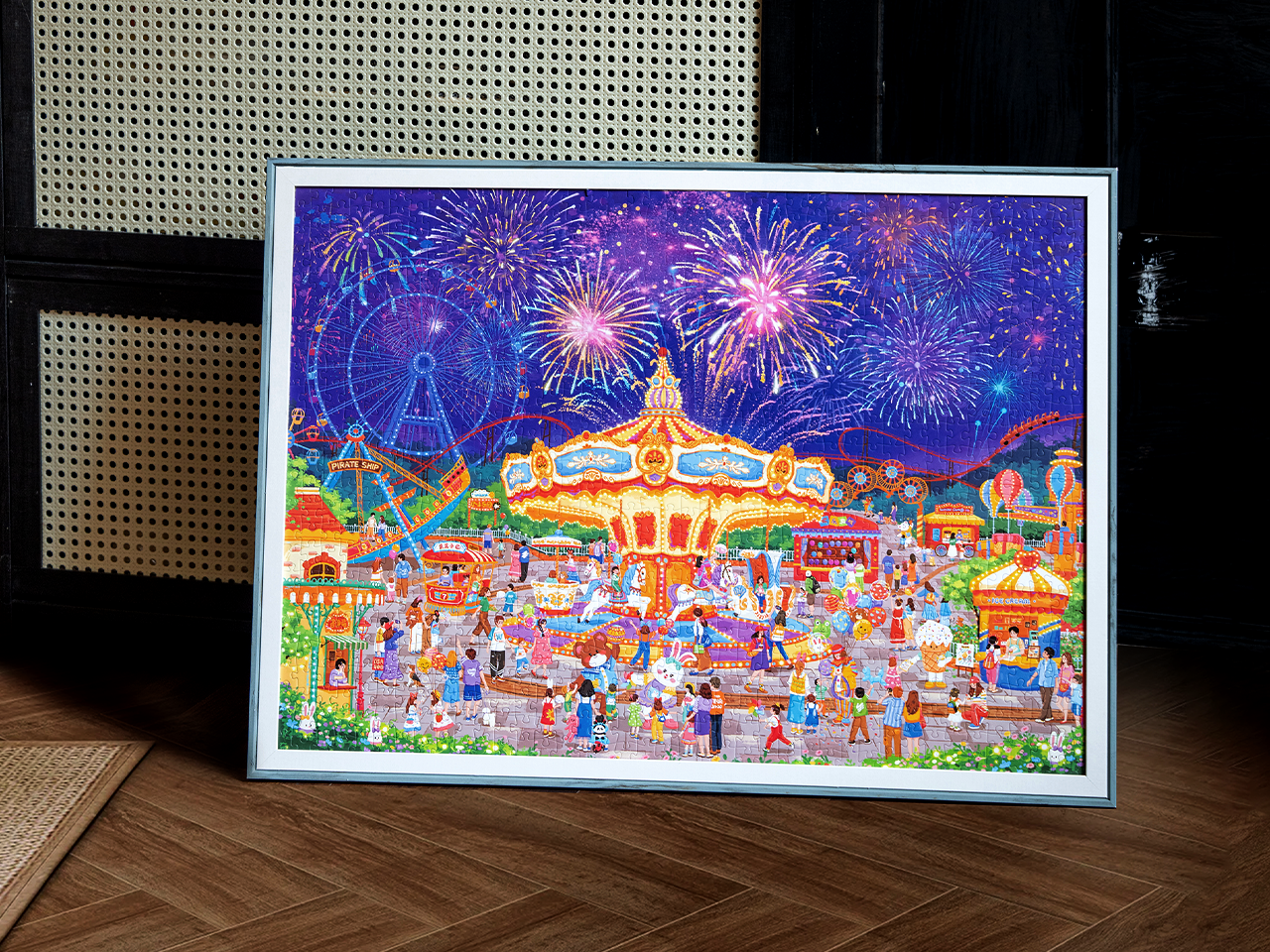 这幅画描绘了游乐园热闹的夜景。夜空中绽放着炫目的烟花,紫色、金色与蓝色交织,如同梦幻的星河倾泻而下。画面中央,华丽的旋转木马散发着温暖的黄色光芒,装饰精美并配有可爱木马,洋溢着孩子们的欢笑声。环绕旋转木马的是各种游乐设施,包括缓缓转动的巨型摩天轮、海盗船和过山车,全都点缀着五彩灯光,营造出欢乐氛围。游乐园里人头攒动——牵手游逛的情侣、嬉笑奔跑的孩童、推着婴儿车的家庭——每个人脸上都洋溢着幸福的神情。