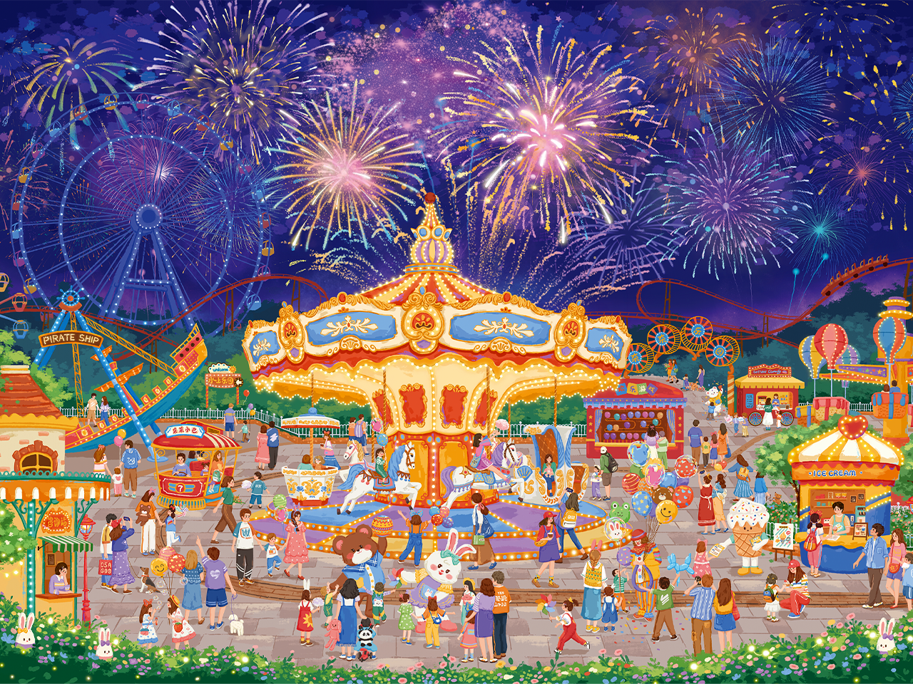 现场还有巨型卡通人物互动和售卖可爱零食的摊位,处处都是生机勃勃的景象。整个场景色彩明快,生动展现了夜间游乐园的欢乐与奇幻,仿佛能听见烟花的轰鸣与人群的欢笑,令人沉浸在这片繁华美好的氛围中。