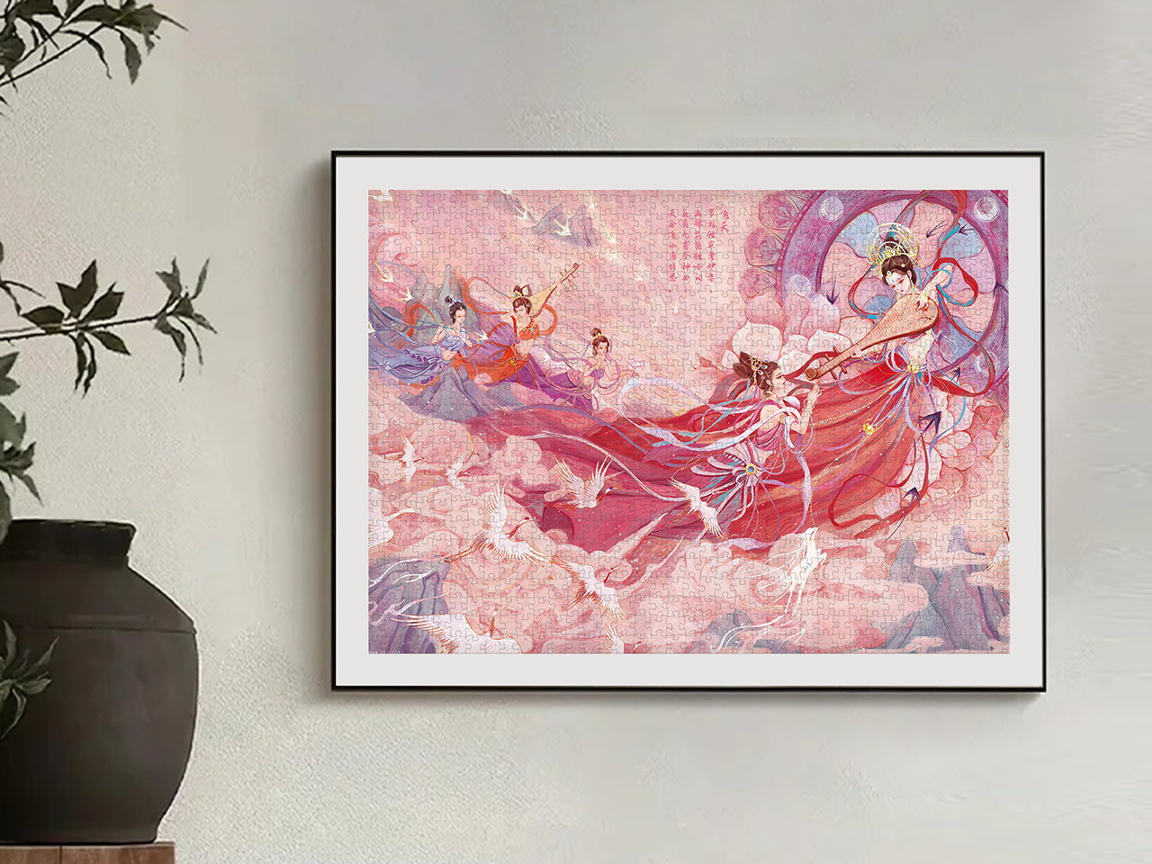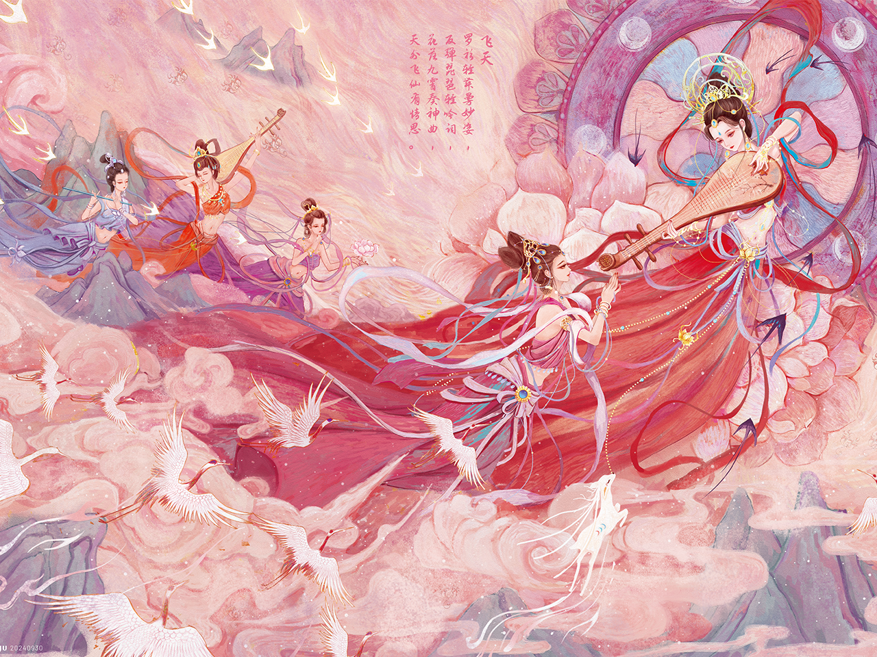 这幅飞天仙女画色彩浓郁,充满了浪漫的神话韵味和空灵飘逸的美感。整幅作品通过细腻的笔触和丰富的色彩,生动地描绘了古代神话中飞天仙人的迷人境界,仿佛将观者带入了一个空灵、空灵的仙境。