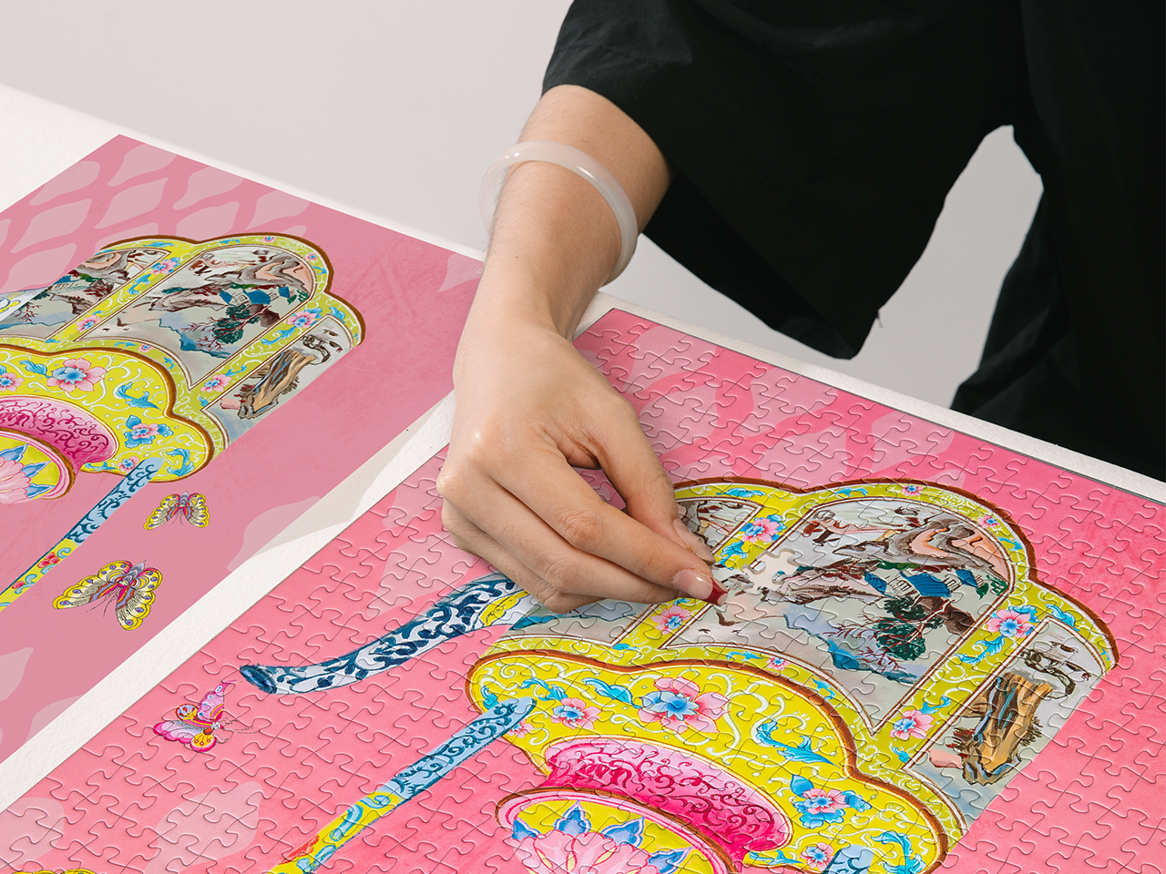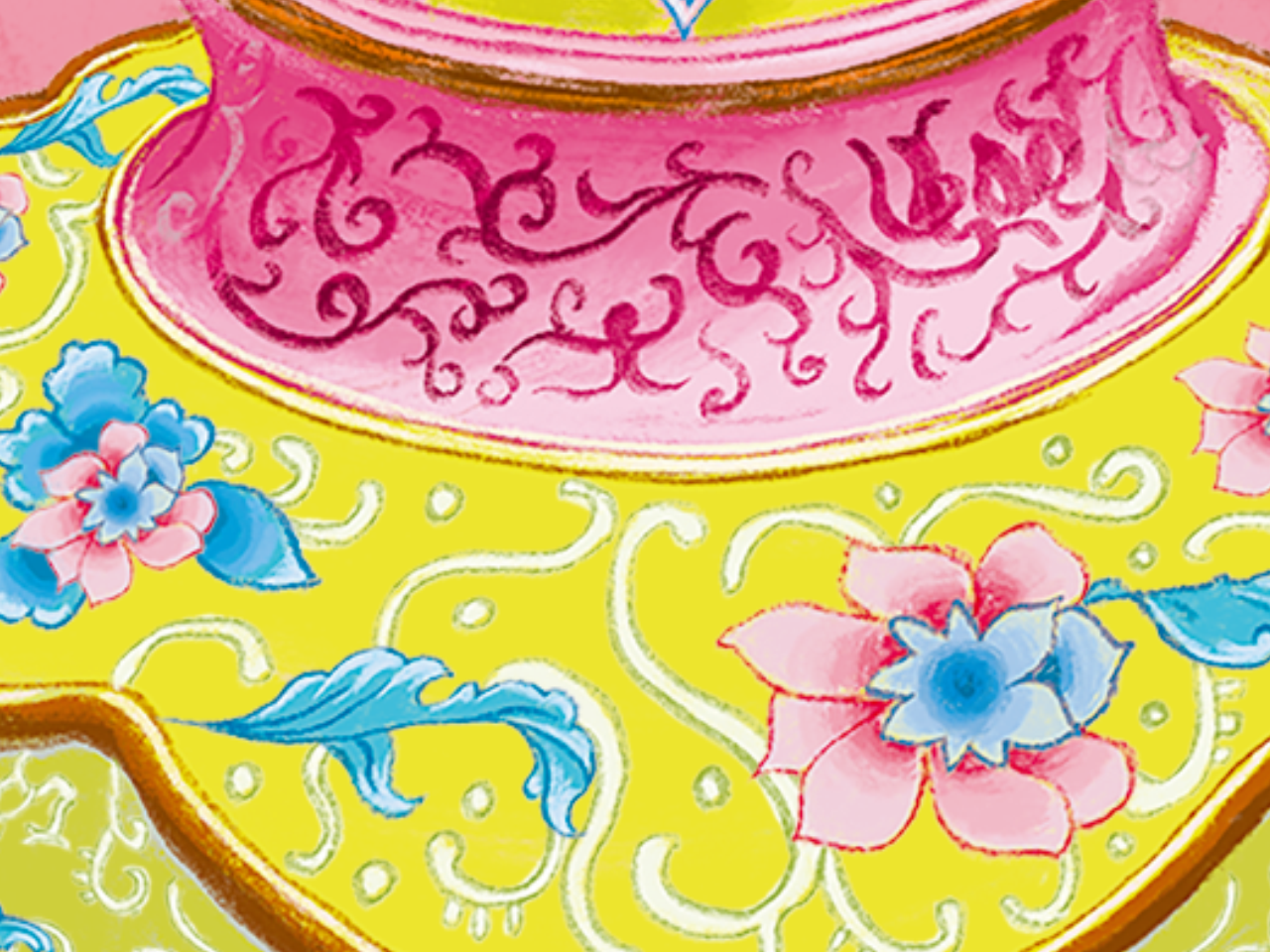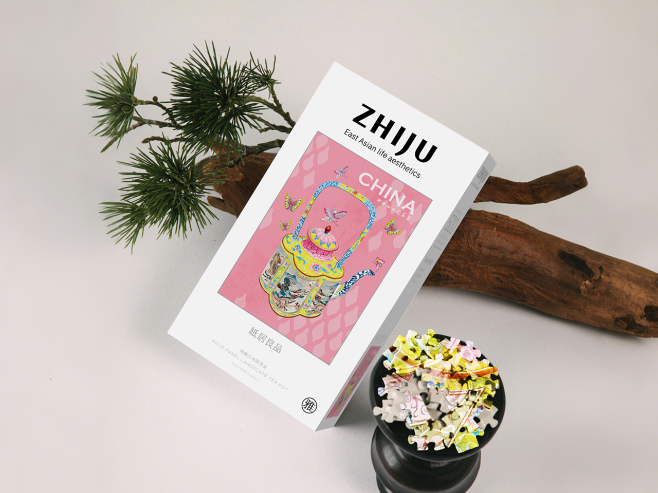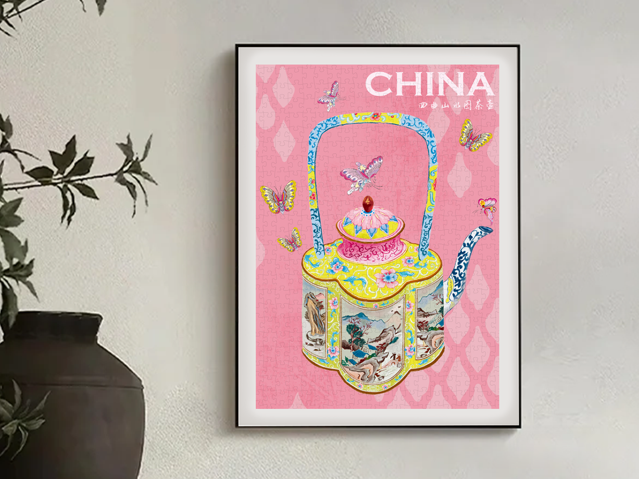 四曲山水茶壶,制作于18世纪下半叶乾隆年间。壶高17.3厘米,宽23.6厘米,底径9.5×8.4厘米,现藏于香港中文大学文物馆。壶身呈四曲造型,四面开光饰以山水、舟船与行旅图景。山水布局分近、中、远景,人物树木花卉皆以疏朗写意笔法勾勒。