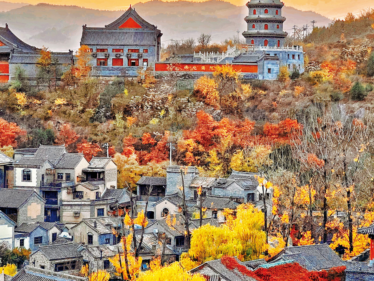 这幅作品徐徐展开一幅永恒诗意的秋日画卷,宛如一首可见的抒情古诗。远处,一座古塔如饱经风霜的哲人矗立在云雾缭绕的山巅,以质朴庄严的姿态承载千年岁月。近处,黑白分明的古民居错落有致地栖息于大地,被漫山遍野的斑斓秋色温柔环抱——红黄交织的枝叶如火焰与黄金相融,构成如画景致。夕阳的暖光如金纱倾泻,为每片枝叶与瓦片披上温暖滤镜,光与影在静谧中合唱,仿佛低语着时光与往昔的无穷故事。此情此景足以让人沉浸于宁静震撼之美与传统哲思,令人流连忘返。