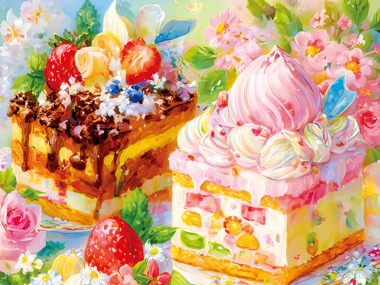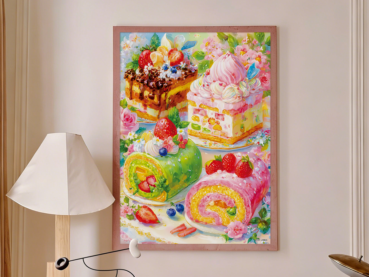 这幅名为“美味甜品”的作品宛如一场华丽的甜点之梦。画面中,精致的蛋糕与甜点卷点缀着缤纷水果与细腻奶油,呈现出明亮柔和的色调,仿佛春日暖阳倾泻而下。每一笔触都细腻刻画出甜点诱人的质感,让人仿佛能闻到甜蜜香气。背景中繁花盛开,更添浪漫氛围。这不仅是一场视觉盛宴,更传递出喜悦与甜蜜,为观者带来满心的幸福与对美好甜品的无限遐想。是装饰与治愈心灵的佳作。