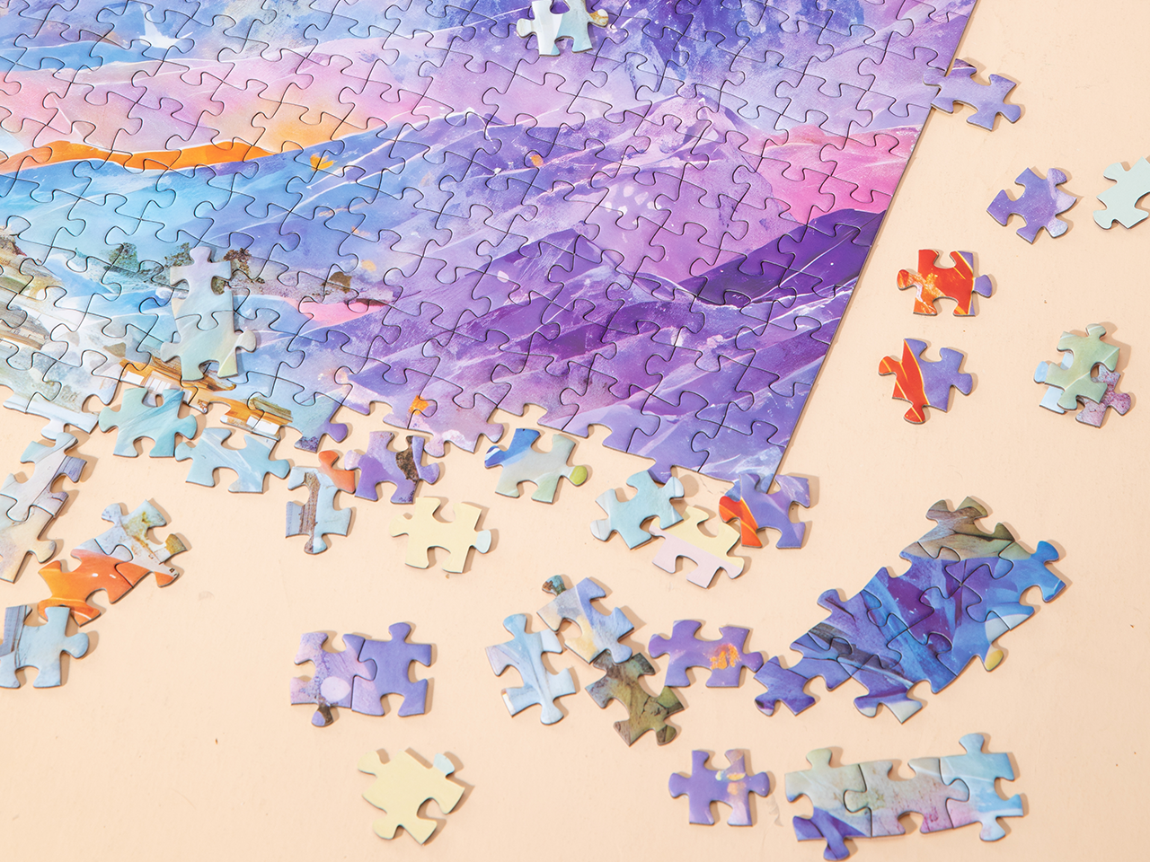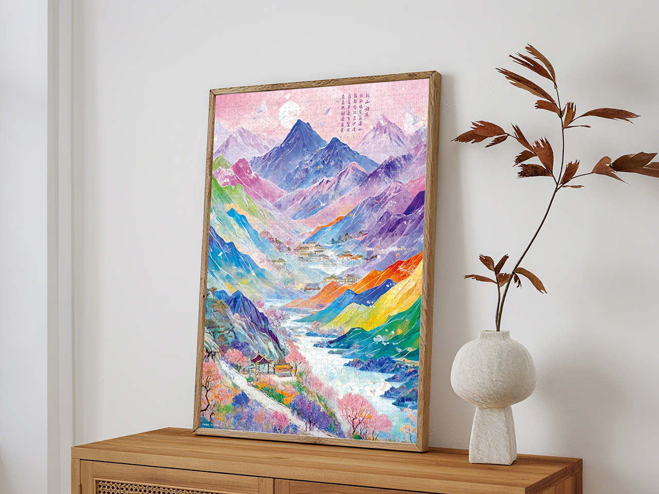 画作中,连绵的群山占据构图主体,巍峨峰峦高悬头顶。山坡以丰富色彩呈现,从深靛蓝到鲜艳橙黄,再到清新翠绿,如绚烂丝带般交织缠绕,形成强烈的视觉冲击。山峦之间,蜿蜒河流静静流淌,宛若银色缎带,为景致增添一抹生机。