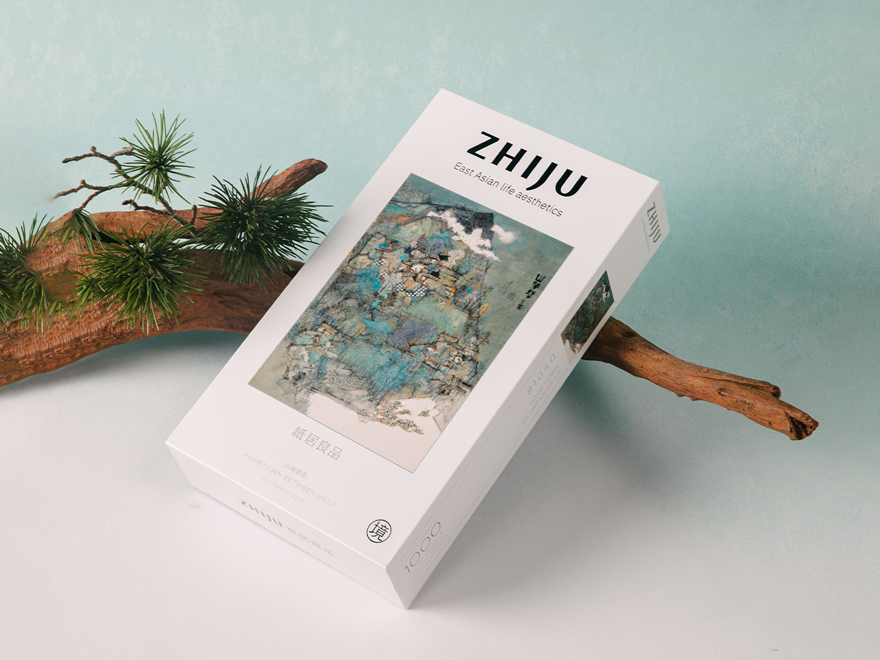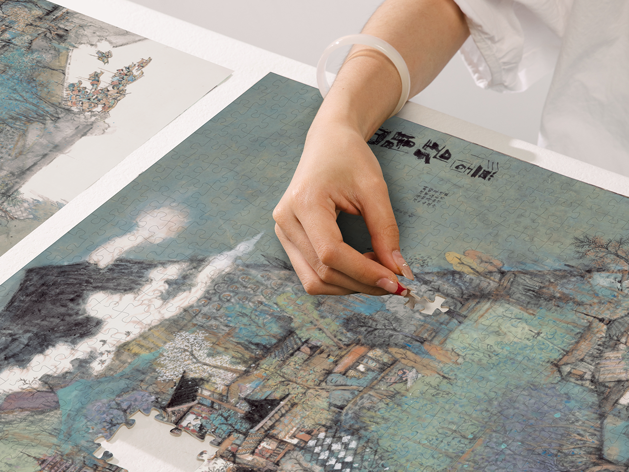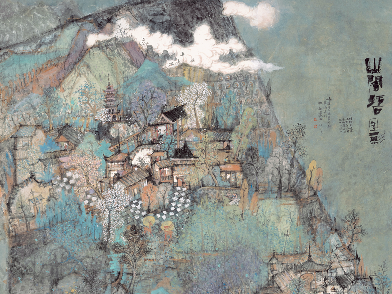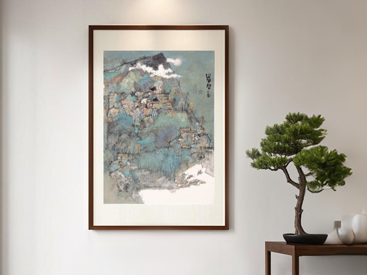 构图中,巍峨群山占据空间上部,山体以青绿为主色调,点缀着灰白色雾气在山谷间悠然飘荡,为画面增添空灵意境。山坡与山脚处错落分布着质朴民居,白墙黑瓦尽显简朴气息。几处屋舍飘出袅袅炊烟,更显人间烟火温暖