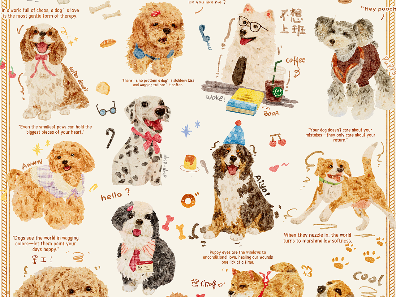 精选多张可爱狗狗图片,以精致水彩风格呈现,每只萌犬表情生动、姿态活泼。结合温馨场景与趣味细节,重现与毛茸茸伙伴共度的暖心时刻,传递强烈的视觉治愈感。