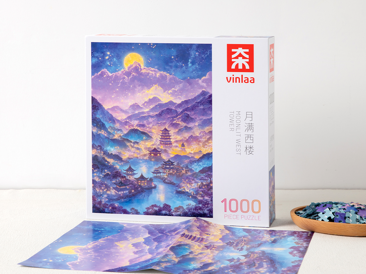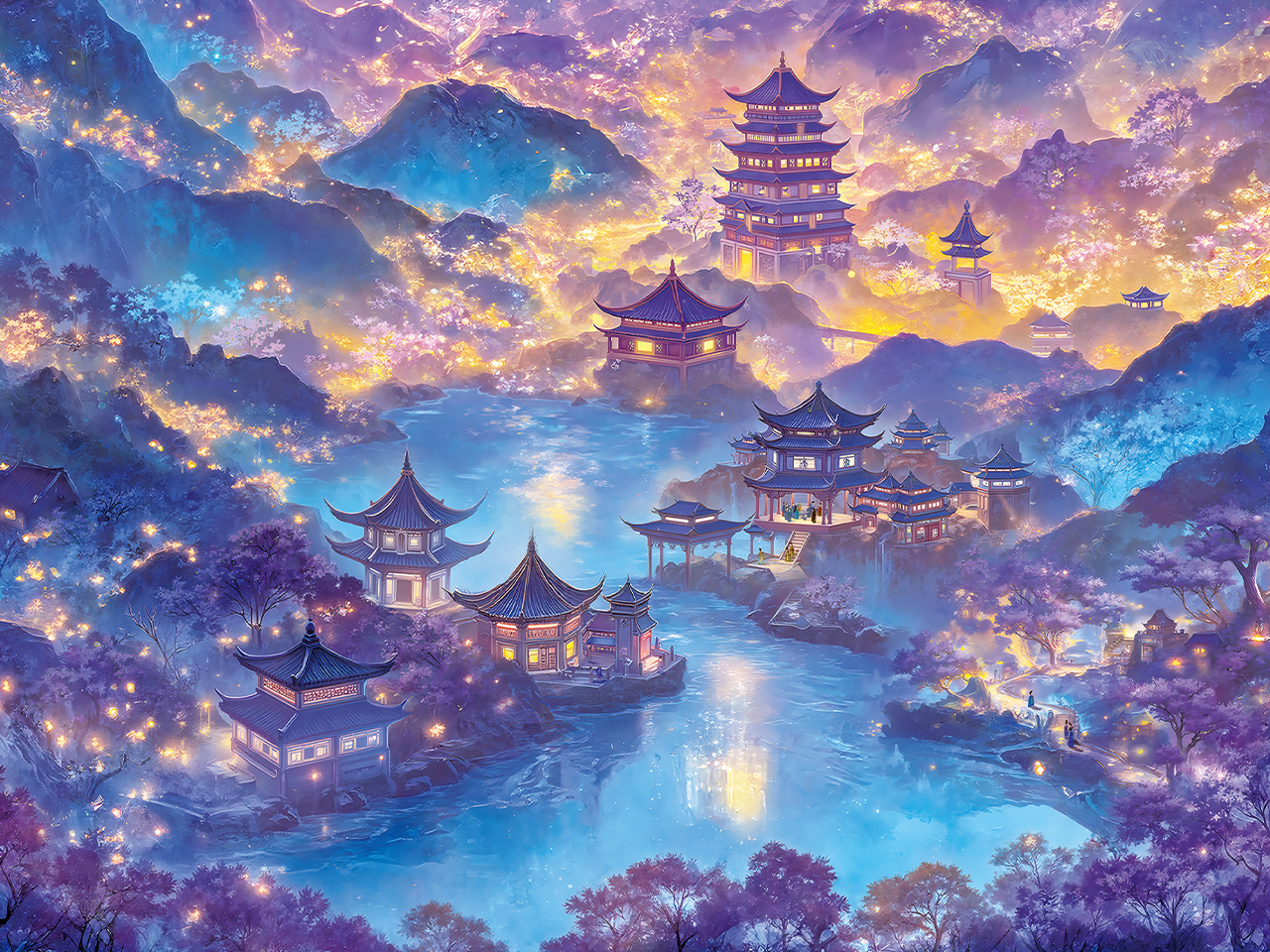 当暮色笼罩天空时,远处的群山就像一条沉睡的龙脊,在月光下泛着柔和的紫水晶光泽。一轮满月如一颗大珍珠挂在山峰之上,将银色的光芒编织成一层薄纱,笼罩在万物之上。山间古刹的灯光一一闪烁,如诸佛撒下的莲子撒在人间,在蜿蜒的河面上洒下金箔的碎片。河水流淌,带着月光,如银河般交织在现实与梦境之间。寺庙飞檐翘起,似托星辰;它的深红色墙壁沐浴在紫罗兰色的薄雾中。钟声穿过雾气,化作透明的波纹,惊动了水面上的波光粼粼。河对岸,温暖的黄光从房屋的窗户里溢出,与寺庙的灯笼遥相呼应,就像一首跨越天地的未完成的诗。