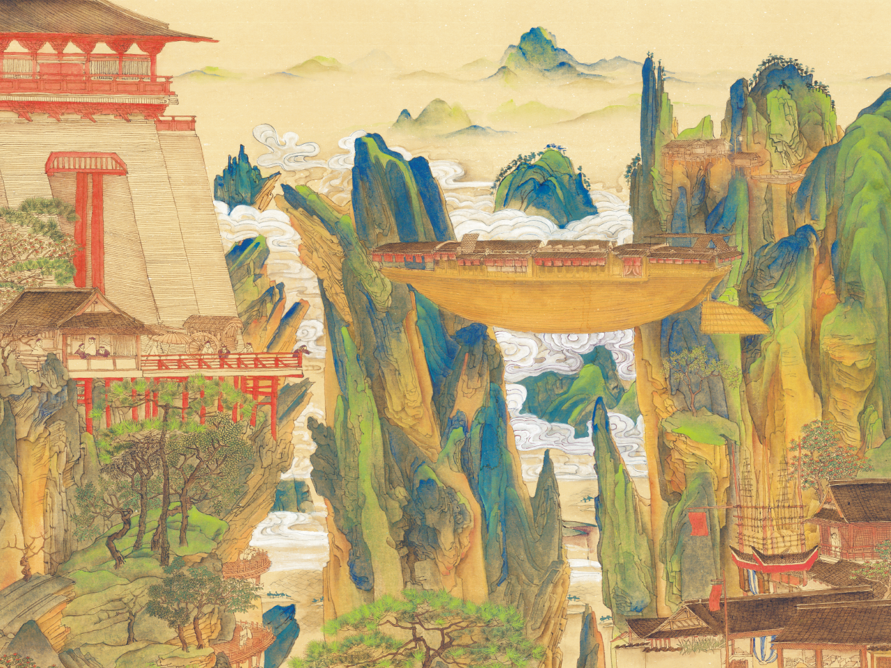 这幅画作呈现奇幻的中国山水景致。背景以青绿山水为基调,描绘了巍峨群山与缭绕云海,营造出空灵悠远的意境。画面左侧可见红墙金瓦的宏伟中式建筑,气势恢宏。建筑旁的石阶与飞檐细节刻画丰富,透露出浓厚的历史底蕴。山峦之间,一艘巨大的'浮空楼船'悬于云雾缭绕的峰峦之间,突破传统框架,充满想象张力。