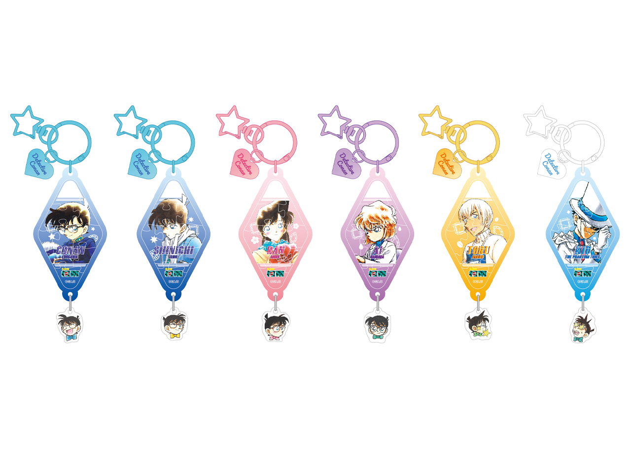 本系列集结六位超人气角色——工藤新一、毛利兰、灰原哀、怪盗基德、安室透与江户川柯南,打造为独特的菱形亚克力拼图!每片菱形拼图不仅精美展现角色魅力,更暗藏惊喜——附赠趣味柯南迷你头饰配件!