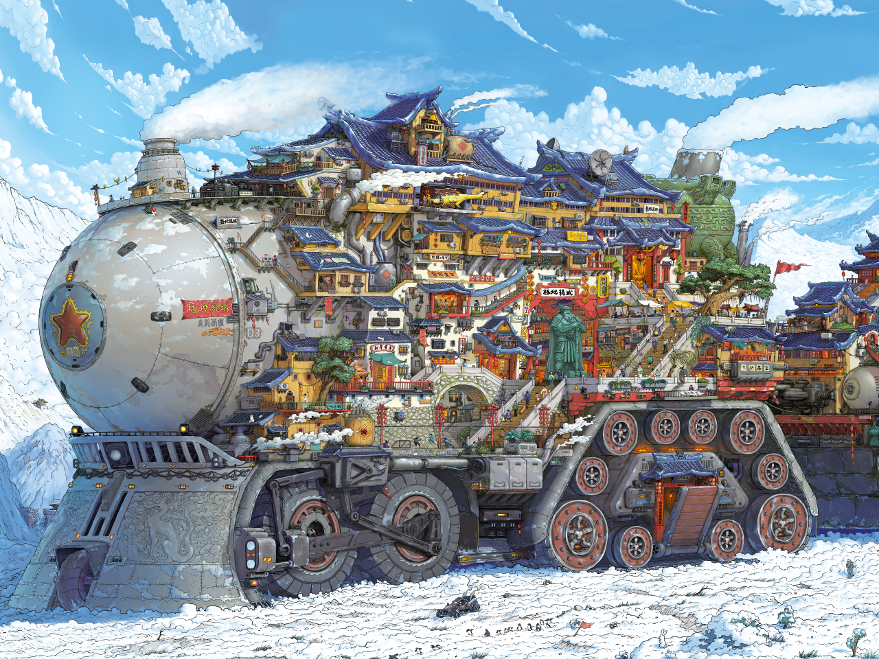 经过长途跋涉,人们找到一处资源丰富且地震罕发的地区,只是这里终年严寒,虽不比外界艰苦多少,但人们已受够地震困扰。数十年前,移民至此的人们创造了特殊供暖管道,将所有车楼相连,建成了首座也是唯一一座御寒的车楼城。如今极地车楼城已发展至第三代,穿行于极地之间,形成了这座宏伟的极地车楼城。