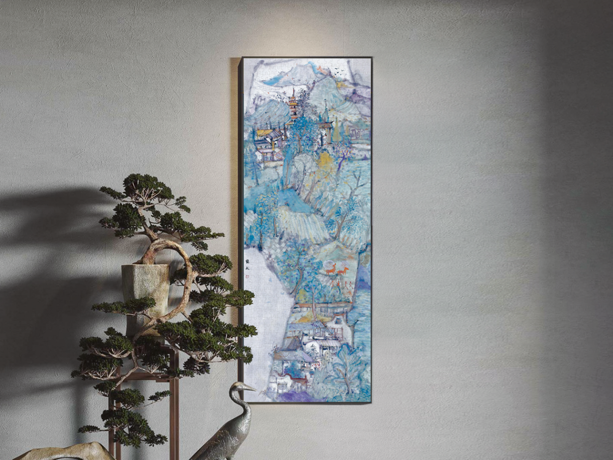 his painting draws inspiration from a sketch of Ling Shan in Wuxi, skillfully blending Chinese and Western artistic elements to create a poetic and mysterious artistic space. In the composition, a Buddhist pagoda stands tall, its vibrant colors and rich layers standing out prominently against the predominantly blue-green palette, exuding an air of solemnity and sacredness.
