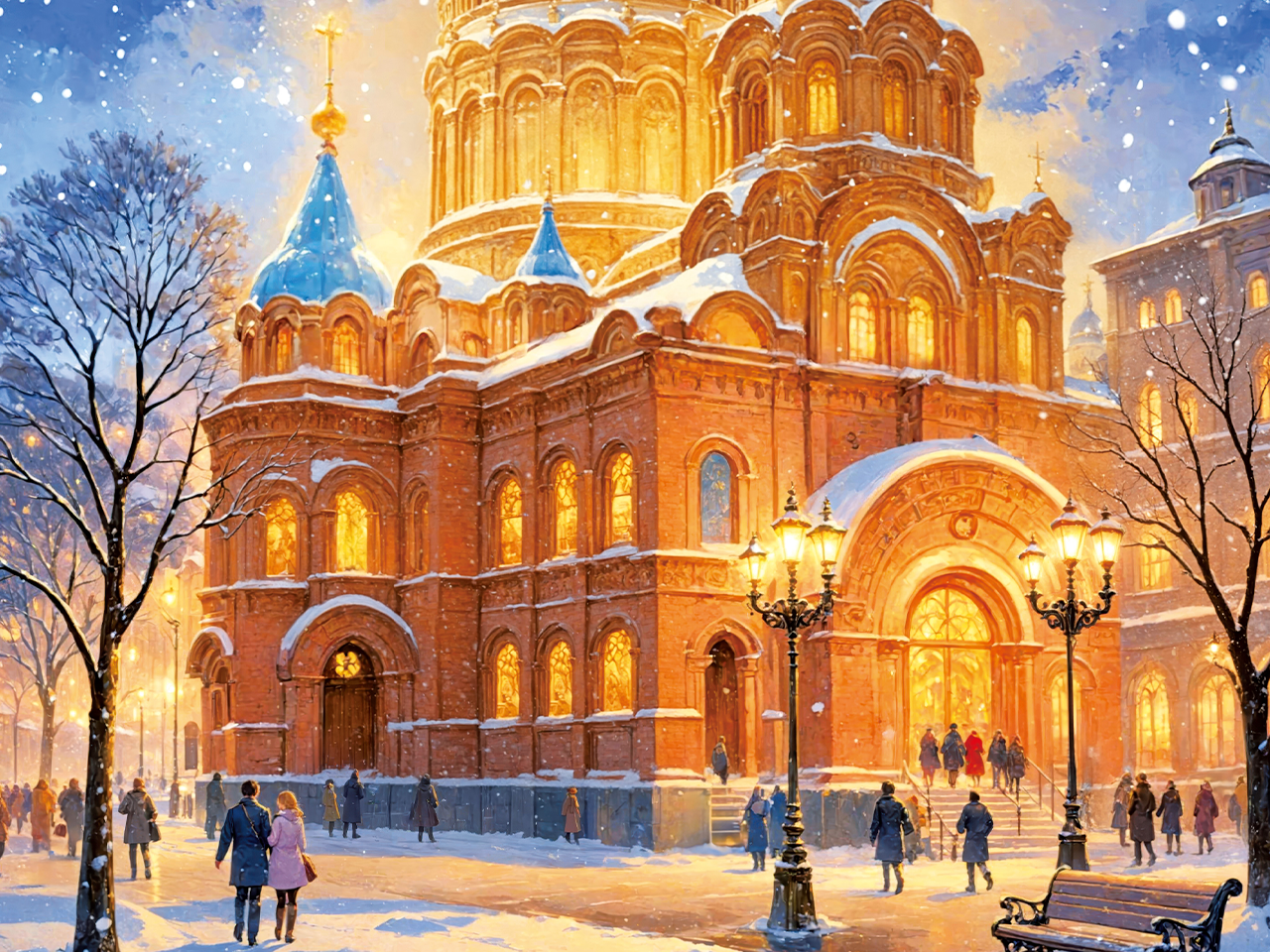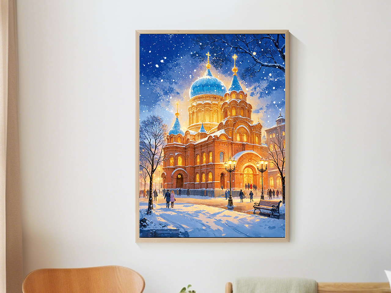 作为大教堂冬季精神的艺术记录,它承载着定格在时间里的珍贵历史记忆,因而具有重要的历史价值。画面中,大教堂巍然矗立,巨大的蓝色穹顶和高耸的金色十字架在宁静的雪夜中闪烁着微光,与窗户内散发出的暖黄色光芒融为一体,驱散了刺骨的寒冷,给人一种静谧的慰藉。雪花在空中飞舞,树木银装素裹,静谧而立,路灯泛着朦胧的光芒,稀疏的行人悠闲地行走。凉爽的夜晚与温暖的灯光在这里交织舞动,将建筑永恒的庄严与冬夜的静谧浪漫完美融合,引导观者沉浸式体验其独特的历史厚重与冬日之美。