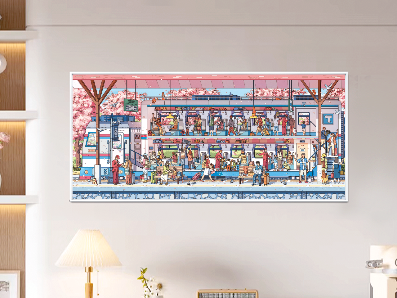 背景中盛开的樱花树为场景增添浪漫气息,粉嫩花朵与蓝天相映成趣。鸟儿在空中翱翔,松鼠在车顶嬉戏,为画面注入灵动活力。整幅作品色彩明快,细节丰富,生动刻画春日乘火车出行的人们,传递出对旅程充满期待的欢快氛围。