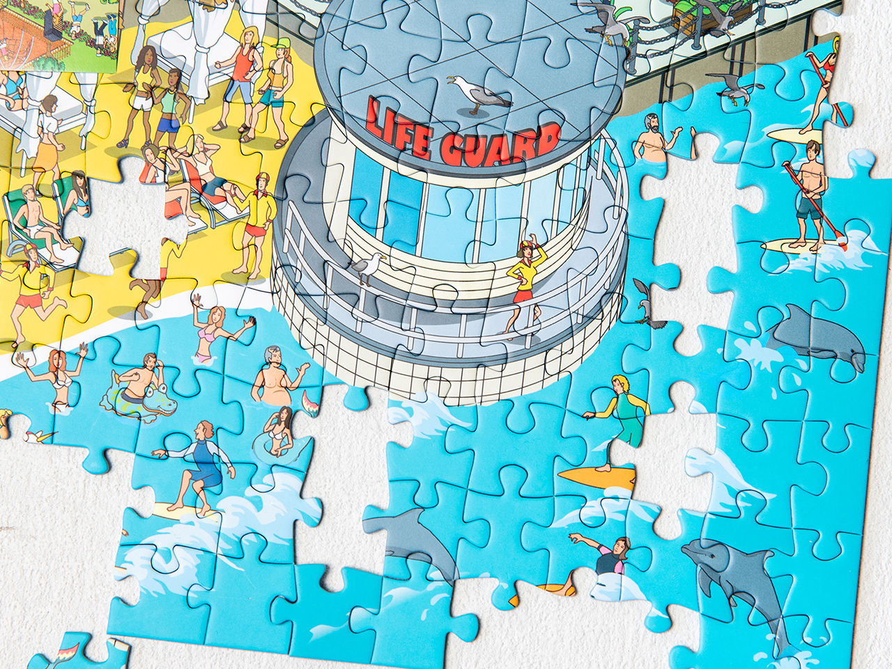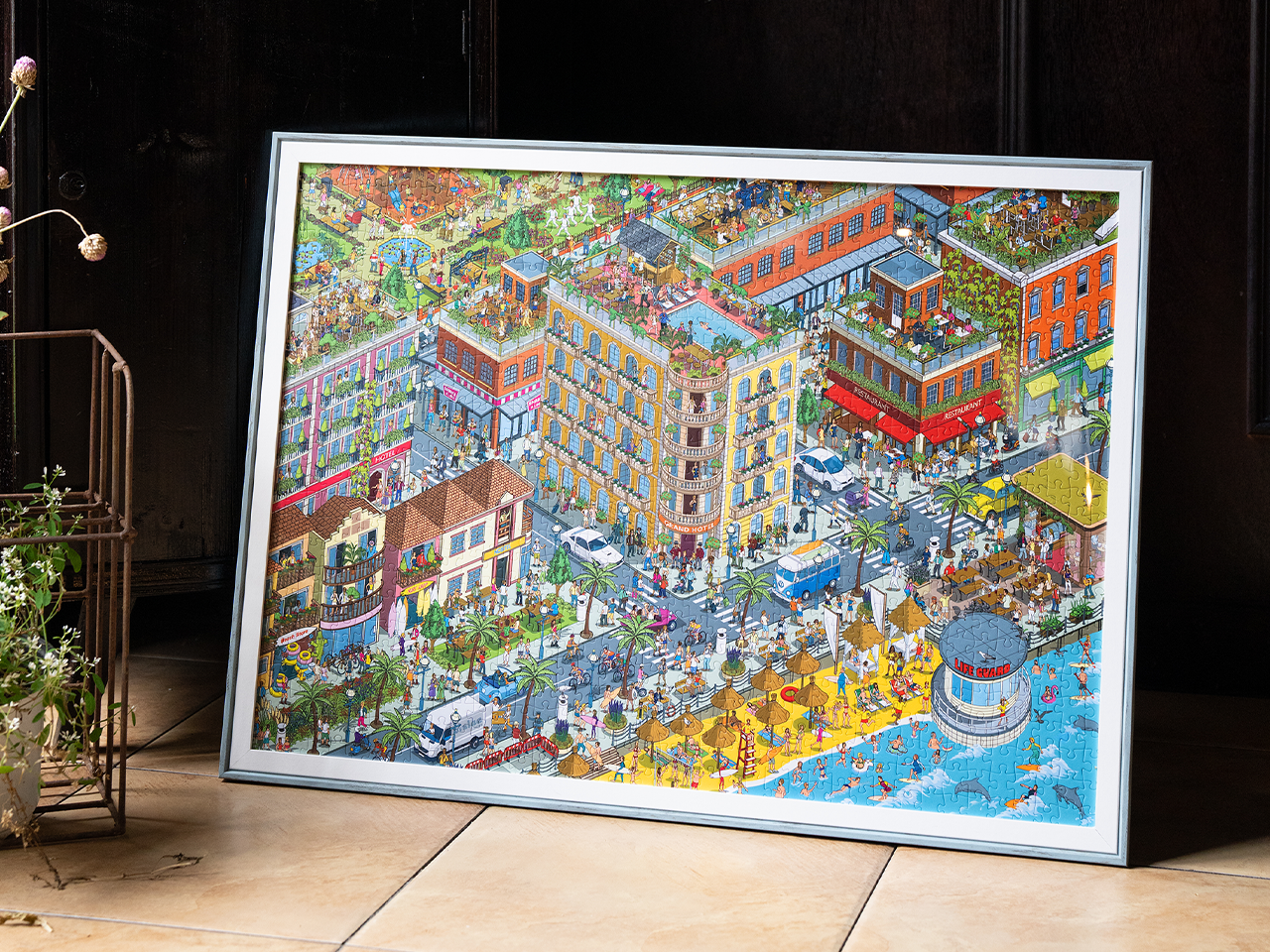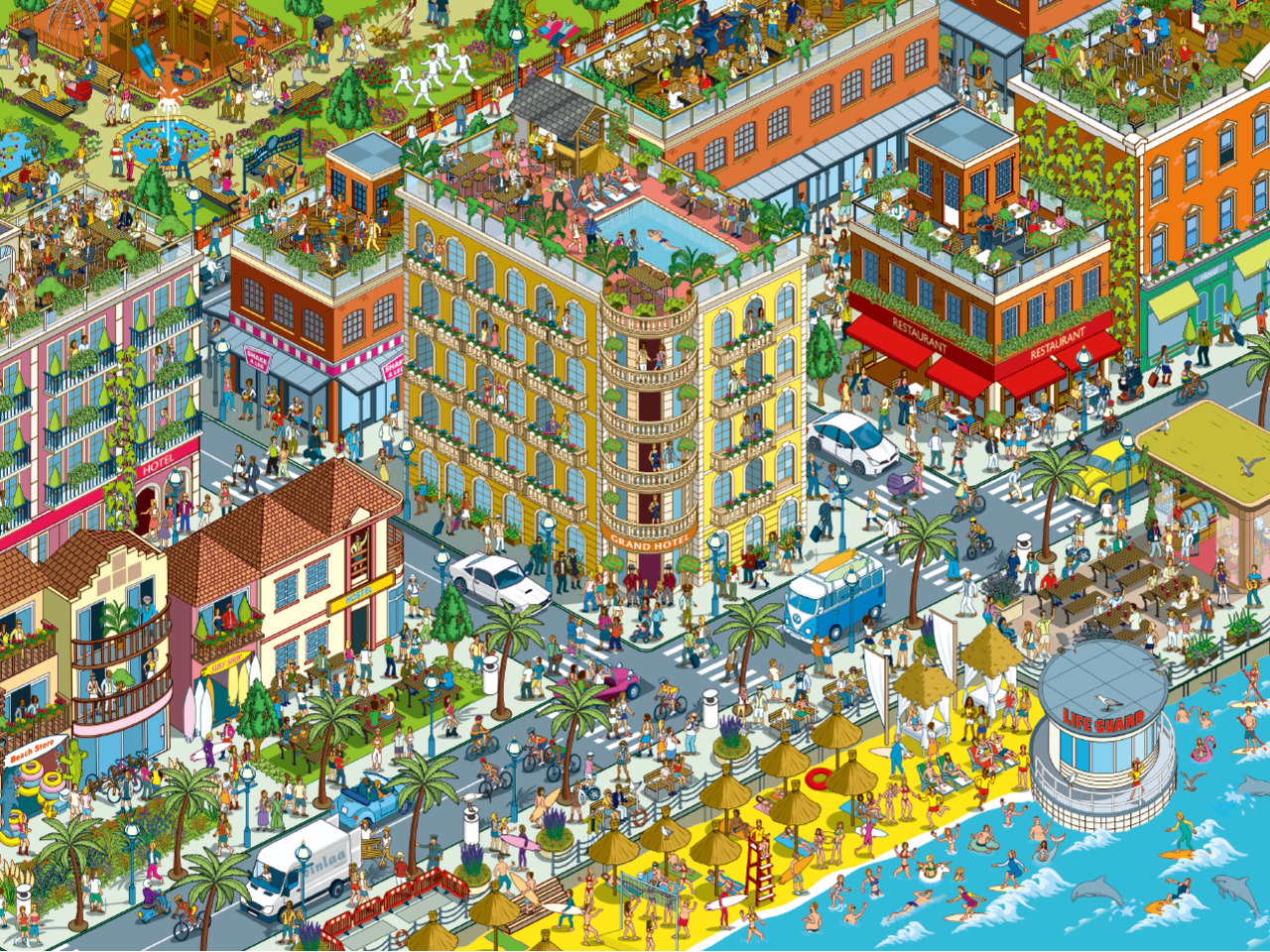 这幅由英国著名艺术家罗德·亨特创作的画作生动捕捉了热闹周末的繁忙场景。画作中,海滩是欢乐的焦点。金色沙滩上散落着遮阳伞,人们或悠闲躺着享受日光浴,或在浅水区与海豚嬉戏,营造出轻松愉悦的氛围。海滩旁的道路上车流不息,白色和蓝色的汽车沿车道行驶,为场景增添了动感。一些人正沿路骑行,享受骑行的乐趣,展现出健康活力的生活方式。