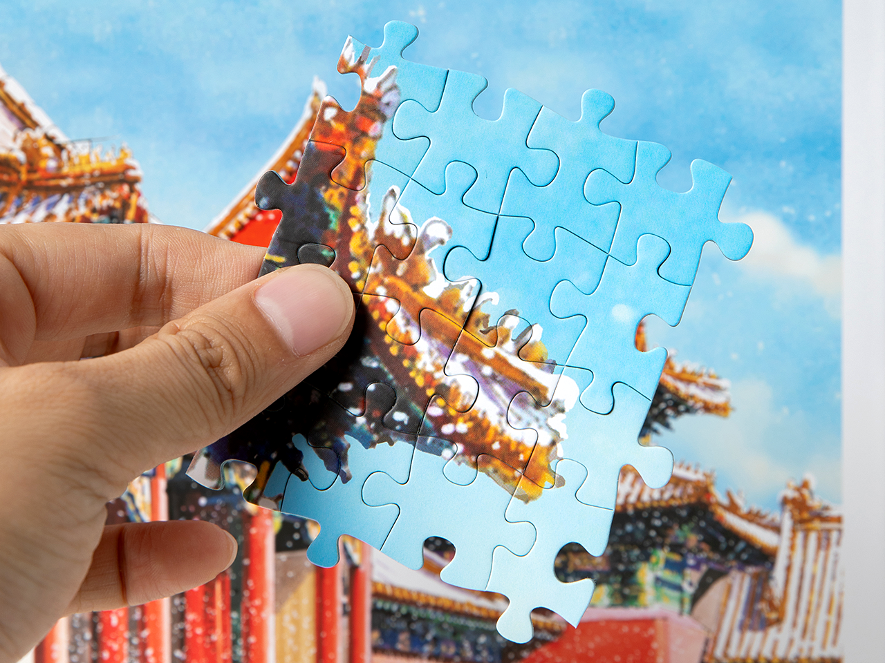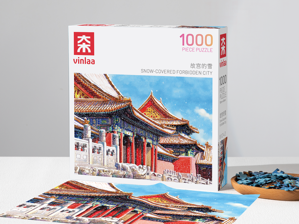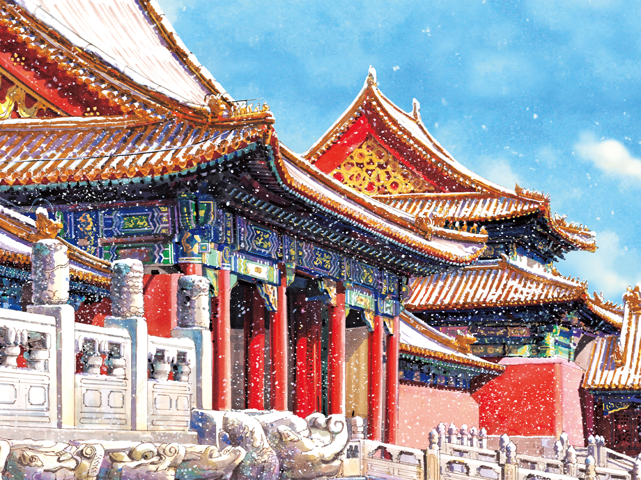 斑驳朱墙与流光金瓦在湛蓝晴空与皑皑白雪的纯净背景下,更显庄严肃穆、神圣不可方物。画家以纤毫毕现的笔触细致勾勒飞檐斗拱的巧构与岁月痕迹;同时,纷扬雪花仿佛被赋予生命,为建筑群注入灵动生机与深邃静谧。色彩既明艳夺目又古韵盎然,成功将紫禁城的巍峨气象与深厚历史积淀浓缩于方寸之间,令人心驰神往,恍若穿越时空。