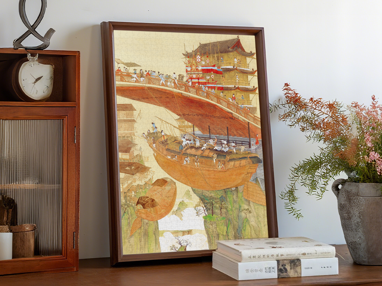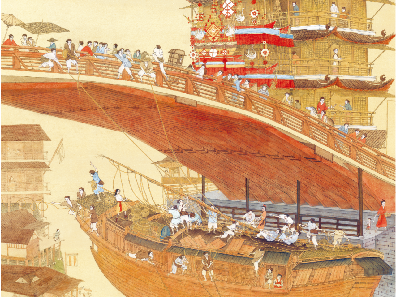 这幅画描绘了一个奇幻又复古的场景。画面中,一座宏伟的木桥横跨景致,桥上行人如织——有的匆匆赶路,有的驻足赏景。桥边的中式亭台装饰华丽,散发着市井繁华的热闹气息。桥下方,一艘巨大的木船悬浮在半空,甲板上人群熙攘,或劳作或嬉戏,打破了现实逻辑,平添几分幻想色彩。