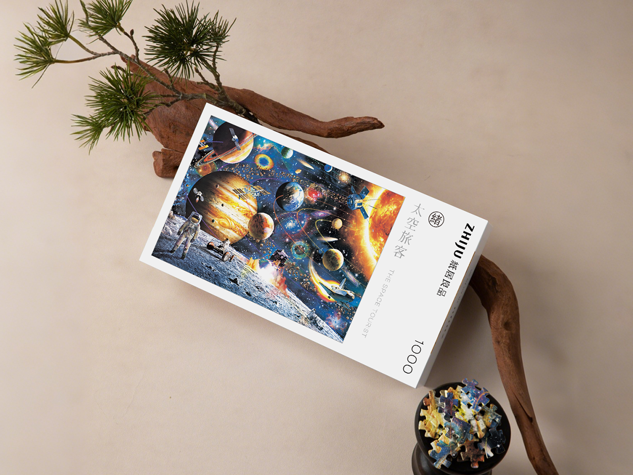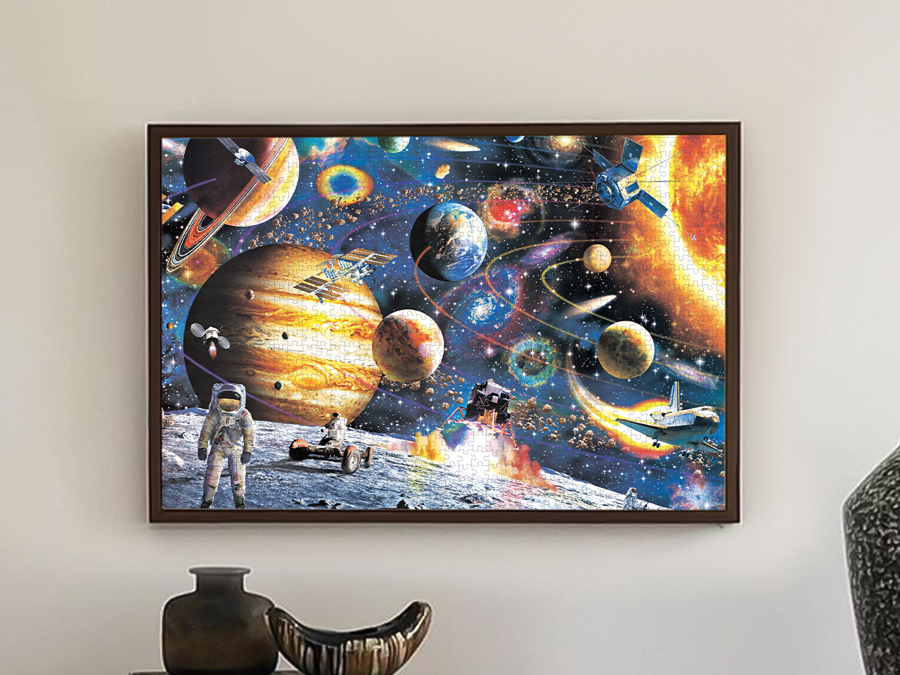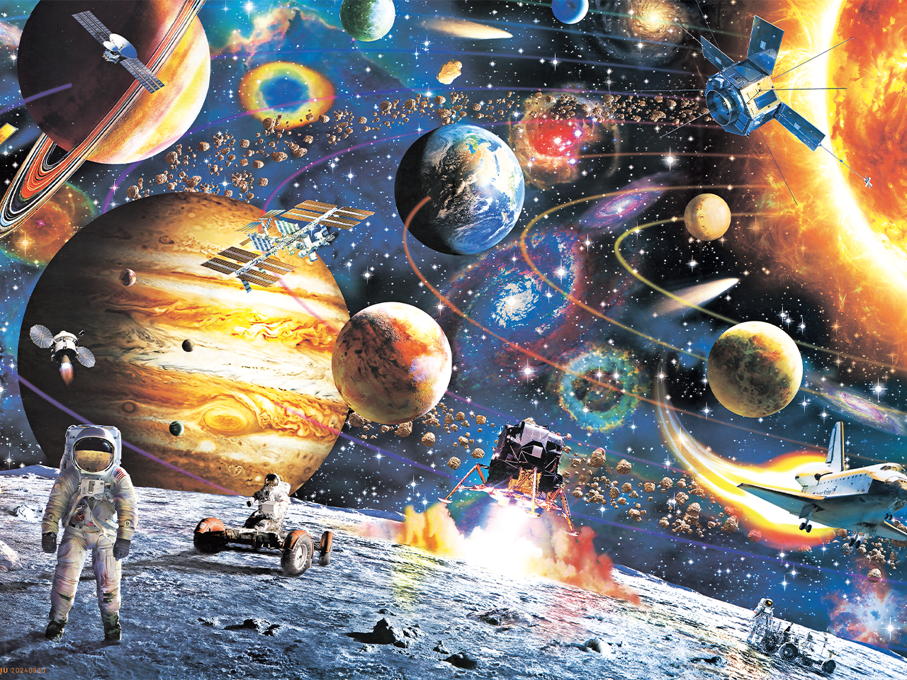 这幅画生动描绘了浩瀚宇宙的奇妙景象。画中最引人注目的是形态各异的行星。木星作为最大行星,以其醒目的橙褐色条纹占据画面主导,散发着宏伟神秘的气息。土星带着标志性的美丽光环,在宇宙中悠然漂浮。其他大小不一、色彩鲜艳的行星散布在深邃的星空之中,仿佛在诉说着宇宙的广袤无垠。