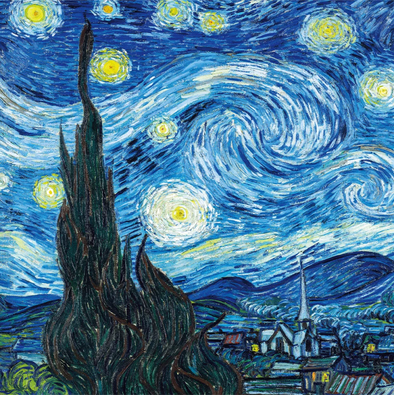 ‘The Starry Night’ was created in June 1889 and is one of Van Gogh's most iconic works. The painting depicts the nighttime view seen from the east-facing window of a mental hospital in Saint-Rémy, Provence, France. In the painting, the sky is depicted as swirling vortexes, with sparkling stars and a crescent moon emitting a dazzling glow, creating a strong sense of movement. Rolling hills, a tranquil village, and towering cypress trees form the landscape below.