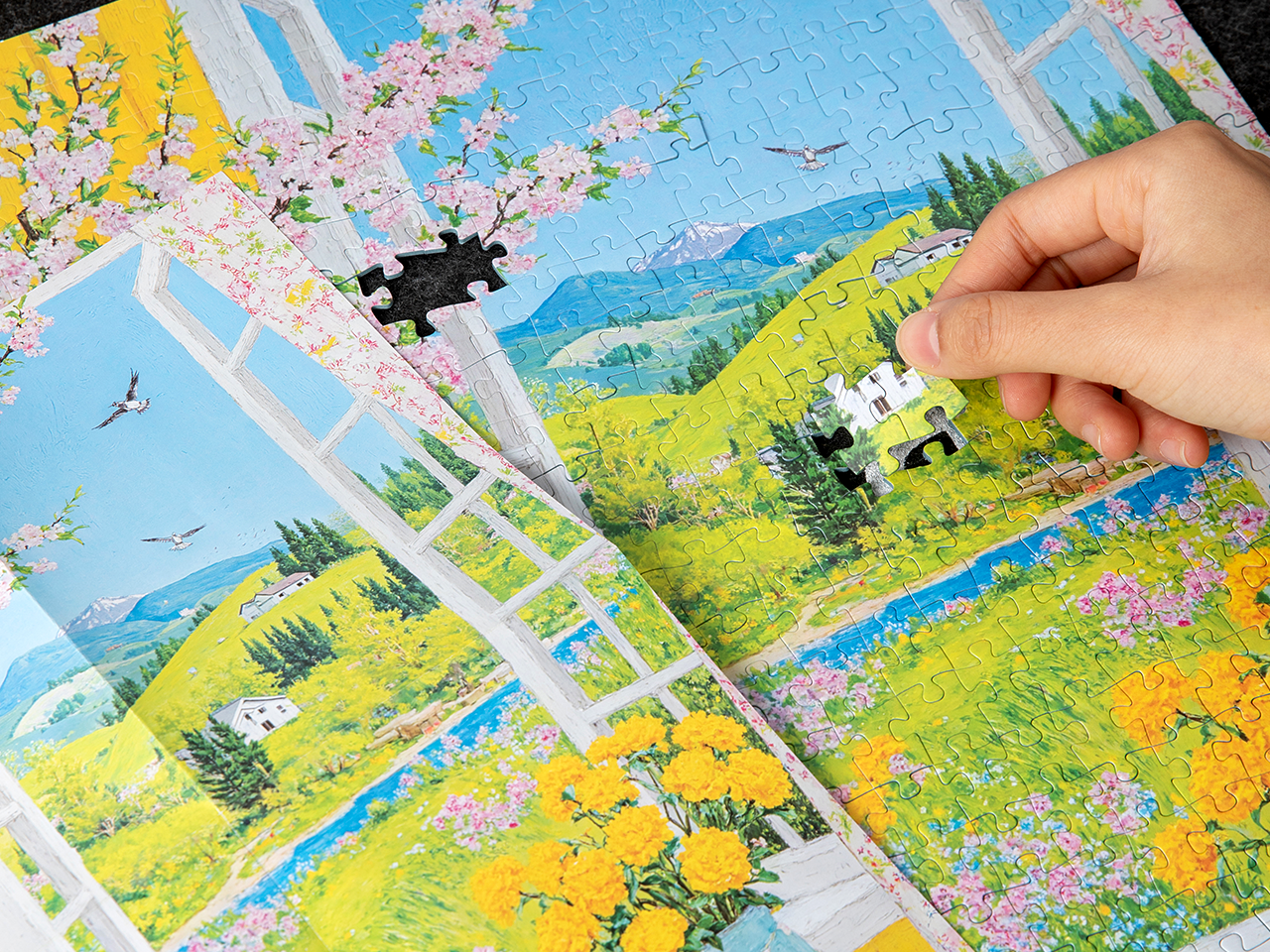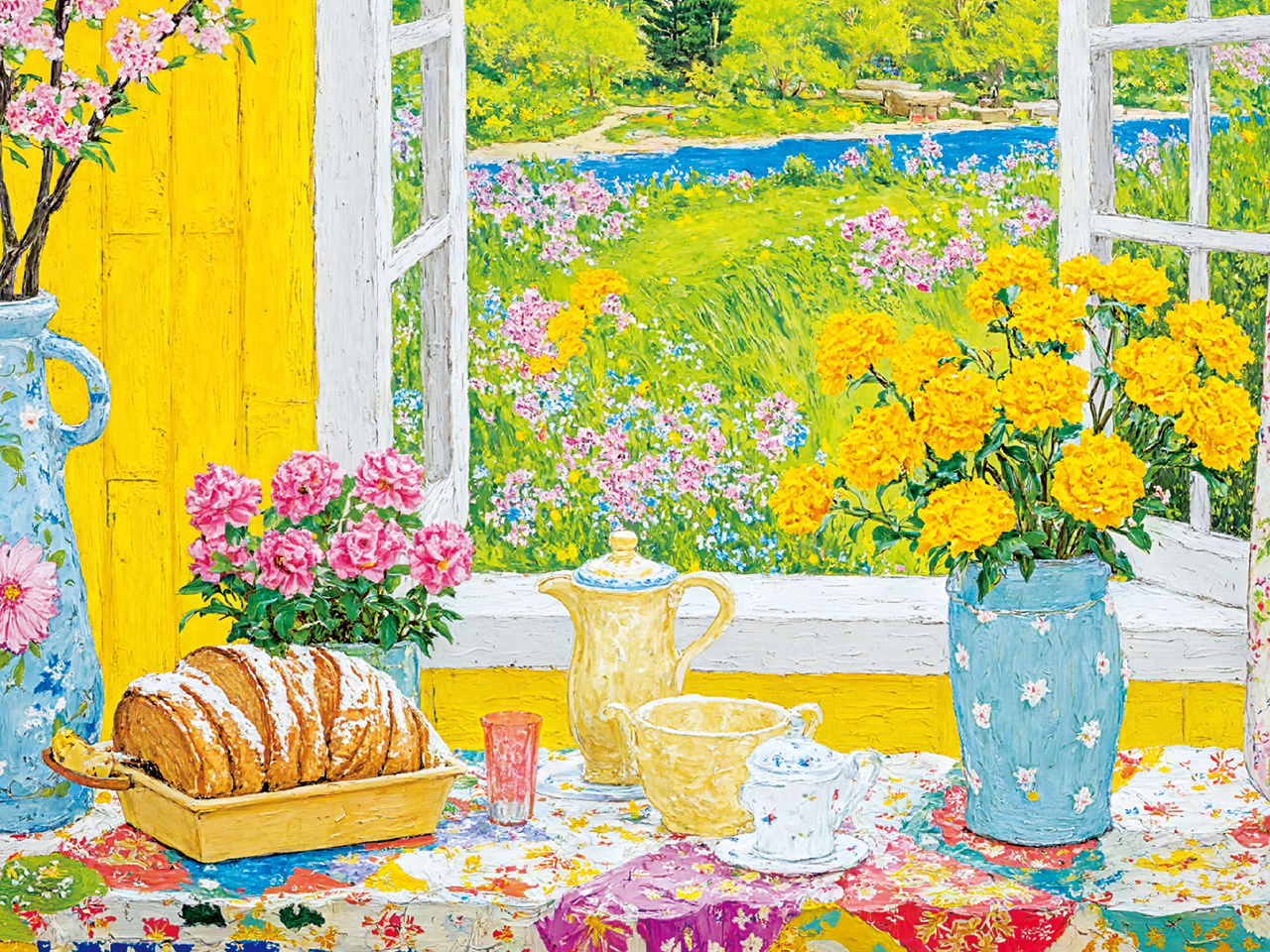这是一幅充满生机与温暖的油画,描绘了室内外和谐美好的景象。整幅作品采用明快愉悦的色调,笔触大胆富有表现力,充满活力,具有强烈的印象派风格。画面完美融合了室内的温馨宁静与室外的自然美景,传达出一种宁静舒适的生活氛围,让人感受到自然之美与生活之闲适。