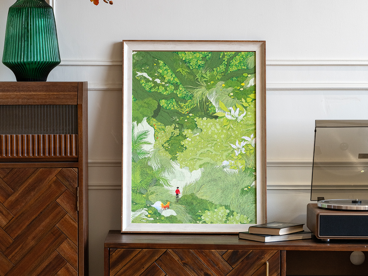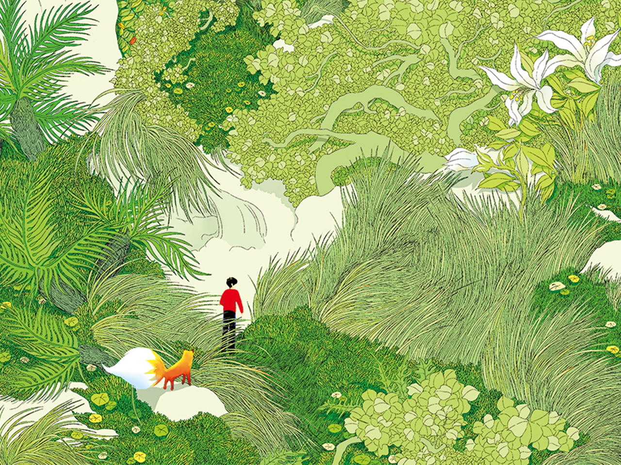 这幅画描绘了一个生机盎然的绿色森林世界,以深浅不一的绿色为主色调,营造出层次丰富的生态景观。画面中,粗壮的树木高耸入云,繁茂的枝桠如绿色伞盖般伸展,树根周围蕨类与青草茂密生长,其间点缀着娇嫩的花朵。一条蜿蜒小径穿行于植被之间,身着红黑衣装的人物沿径漫步,身旁伴着一只橙白相间的狐狸,为场景增添了动感与叙事性。