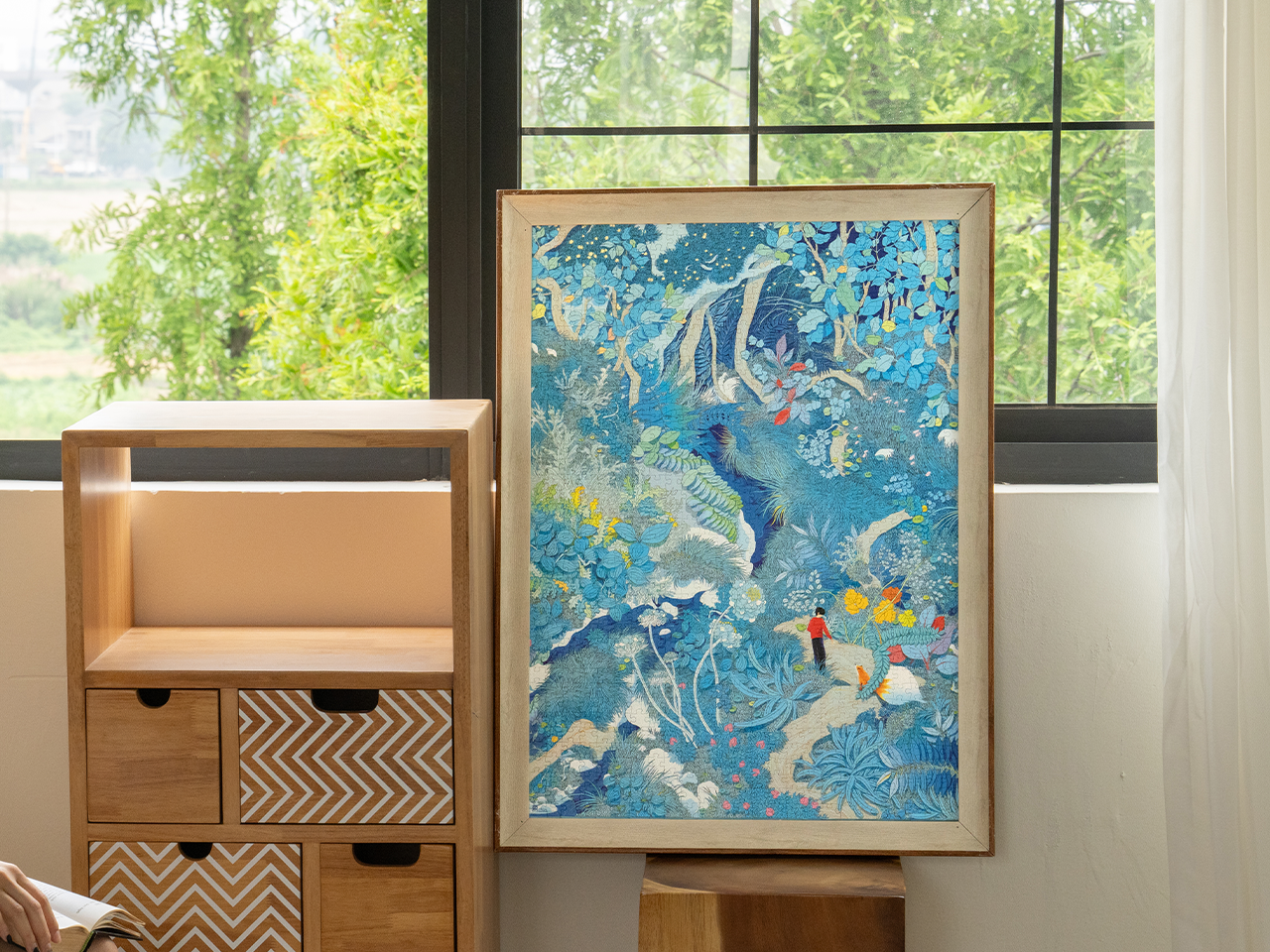 这幅画描绘了一个神奇的森林场景,以蓝绿色调为主,营造出清凉朦胧的氛围,形成宁静梦幻的意境。形态各异的树木枝桠交错,溪流如飘逸丝带般蜿蜒流淌,水花与植被和谐相融。缤纷的花草点缀其间,从淡蓝色花朵到明黄色与鲜艳红色的叶片,在丰富的色彩中完美交融。