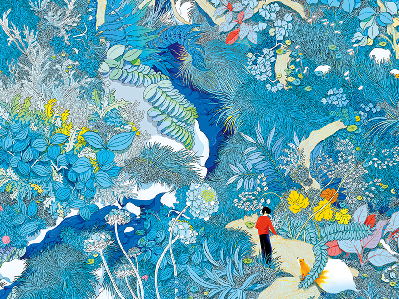 右下角处,身着红黑衣装的人物与橘白相间的狐狸沿小径漫步,为画面注入生机与温暖,仿佛正在诉说故事。整幅作品充满童话般的浪漫与奇幻想象,邀请观者开启一场关于自然、陪伴与美的魔法冒险。
