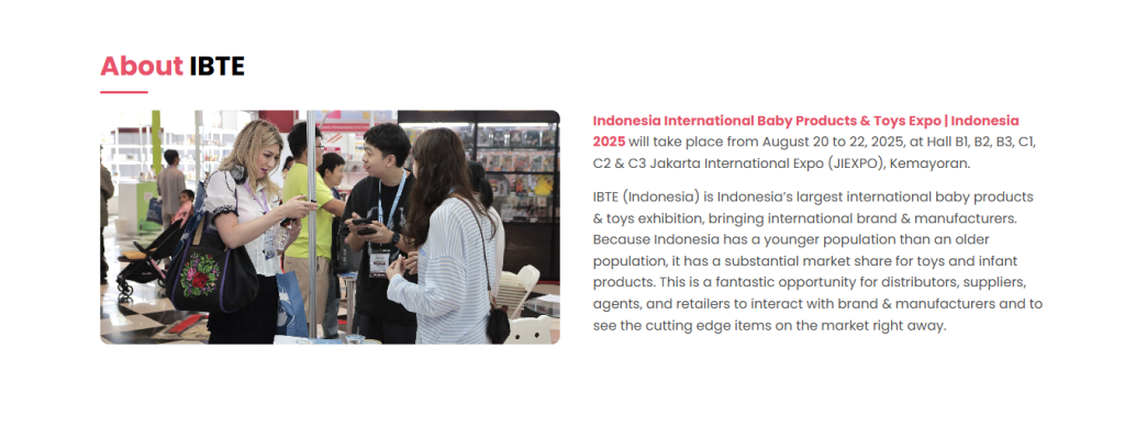 IBTE印度尼西亚国际玩具及婴童用品展旨在为全球玩具及婴童用品企业打造交流平台,促进外贸行业交流与贸易发展,满足买卖双方的商业需求,助力全球经济市场拓展。以印尼及东盟市场为支点,依托UFI认证权威性、政府与协会多方支持及精准跨境贸易服务,IBTE已成为东南亚玩具与婴童行业旗舰展会。展会规模持续扩大,本届展馆面积较2024年翻倍。展品品类紧密跟随消费趋势,新增潮玩与IP两大板块。展会还深度融合电商与供应链资源,为全球企业提供进军新兴市场的高效通道。