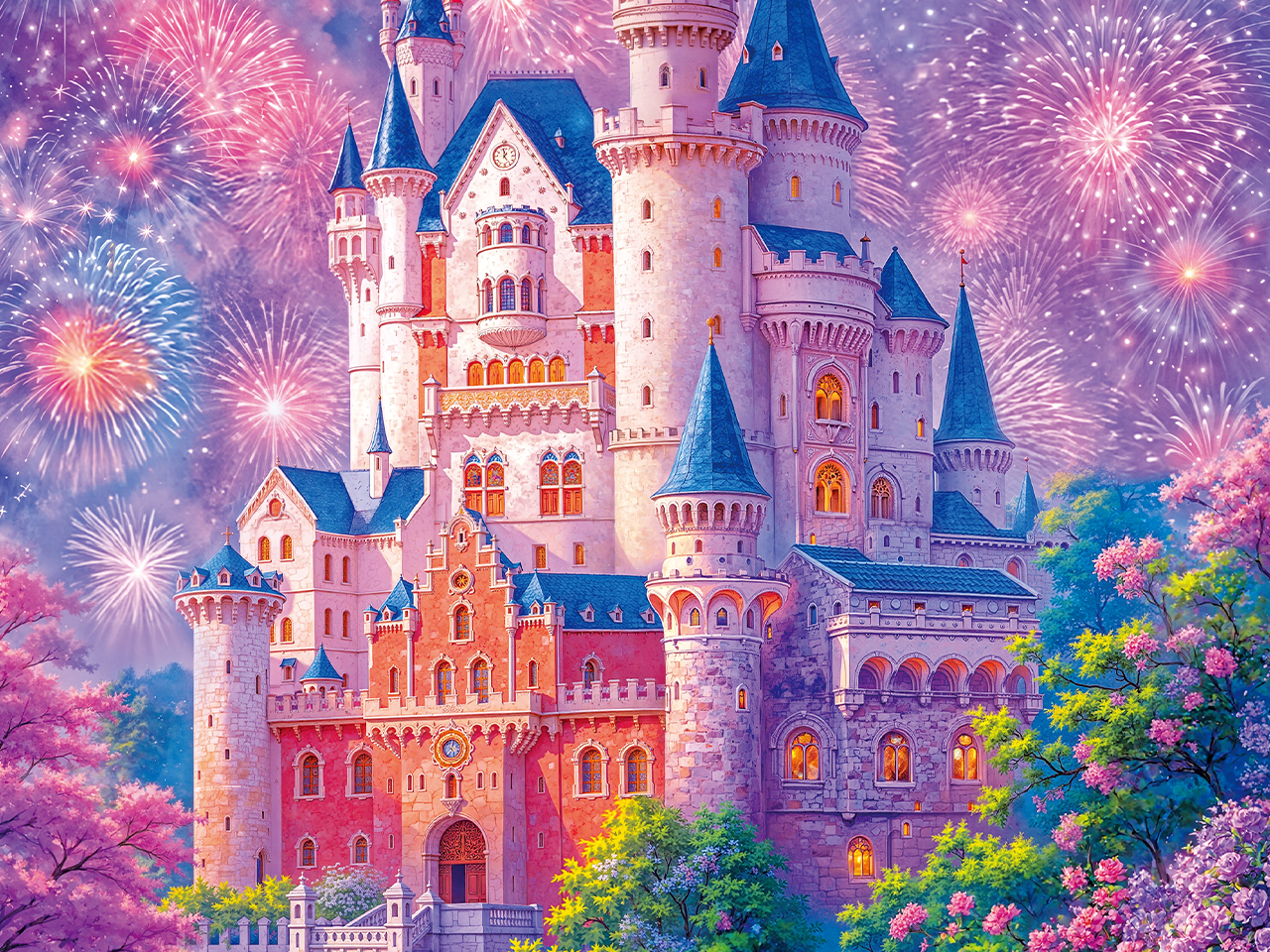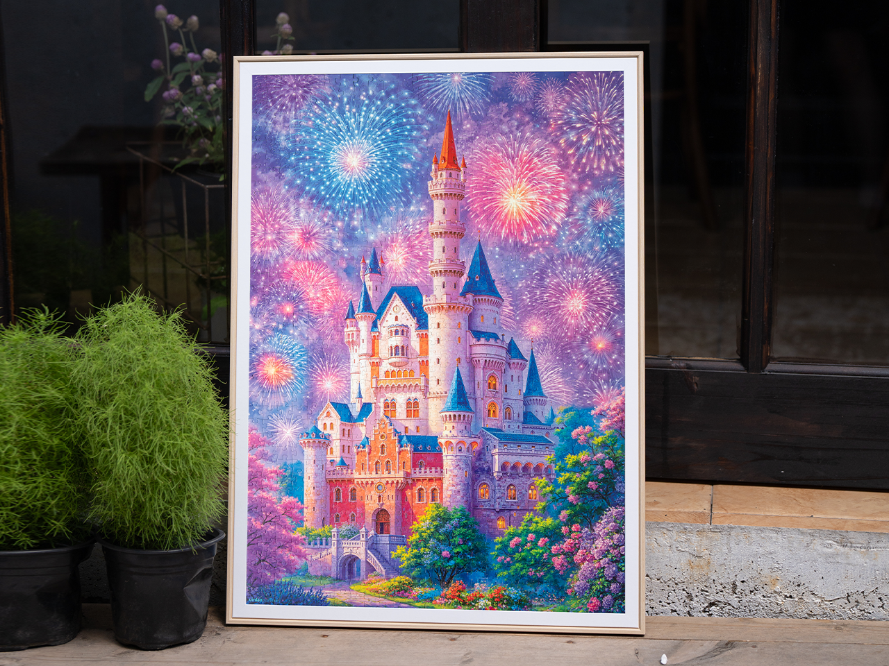 The castle in this painting, set against a sky ablaze with brilliant fireworks, becomes the very embodiment of a dream. A dominant palette of purple and blue interweaves and flows across the night sky, weaving an atmosphere both profoundly mysterious and supremely romantic. The castle is surrounded by a profusion of blooming flowers, which cluster and blossom in quiet reverence, as if silently guarding this transient splendor and beauty. This scene holds the magic to render one speechless, utterly transporting the viewer from reality into the depths of a gorgeous, never-ending fantasy found only in fairy tales.