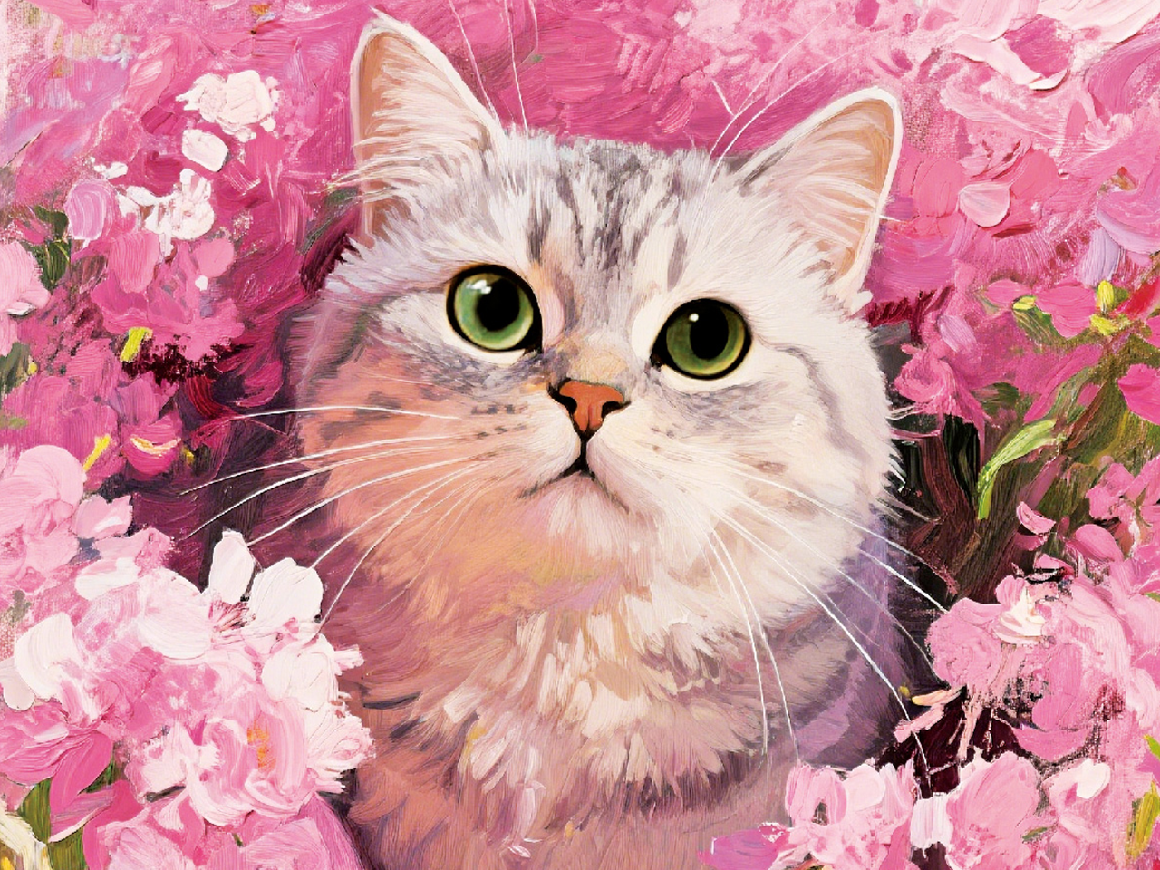 The cat's expressive eyes are endearing. The grey and white stripes contrast sharply with the pink flower field. The oil painting strokes add an artistic touch, making the scene romantic and warm, with excellent decorative effects.