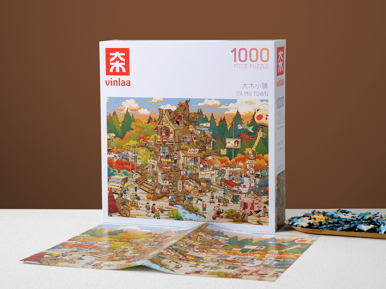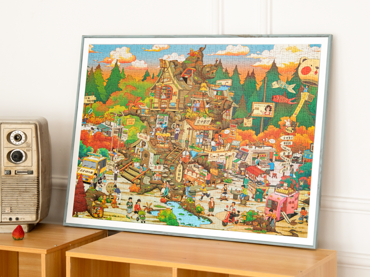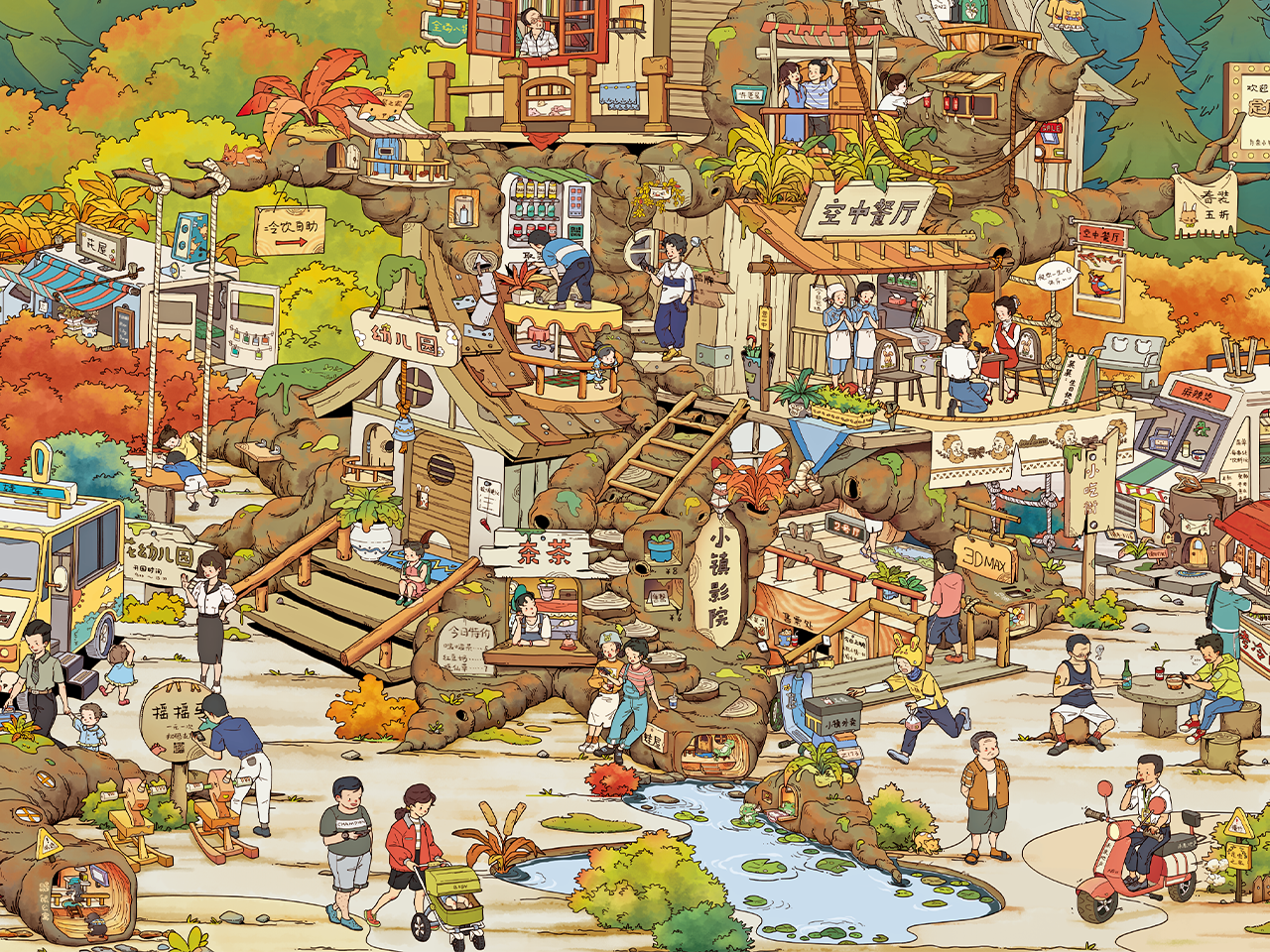 This painting depicts a fairy-tale town brimming with fantastical charm and the vibrancy of everyday life. At the centre of the scene, a massive tree rises majestically from the ground, with various wooden houses neatly arranged on its branches, forming a unique ‘treehouse community.’ Signs hang from the houses, indicating different venues such as an ‘air restaurant’ and a ‘town cinema.’ Both inside and outside the houses, people are engaged in various activities—some preparing meals, others relaxing and enjoying themselves.