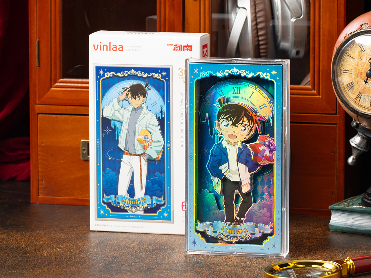 Features eight characters from the Conan gift series: Amuro Tooru, Akai Shuichi, Kudo Shinichi, Kaito Kid, Haibara Ai, Edogawa Conan, Mouri Ran, and Mouri Kogoro. The overall design closely aligns with the gift theme, layered with clock elements to create a striking three-dimensional effect.