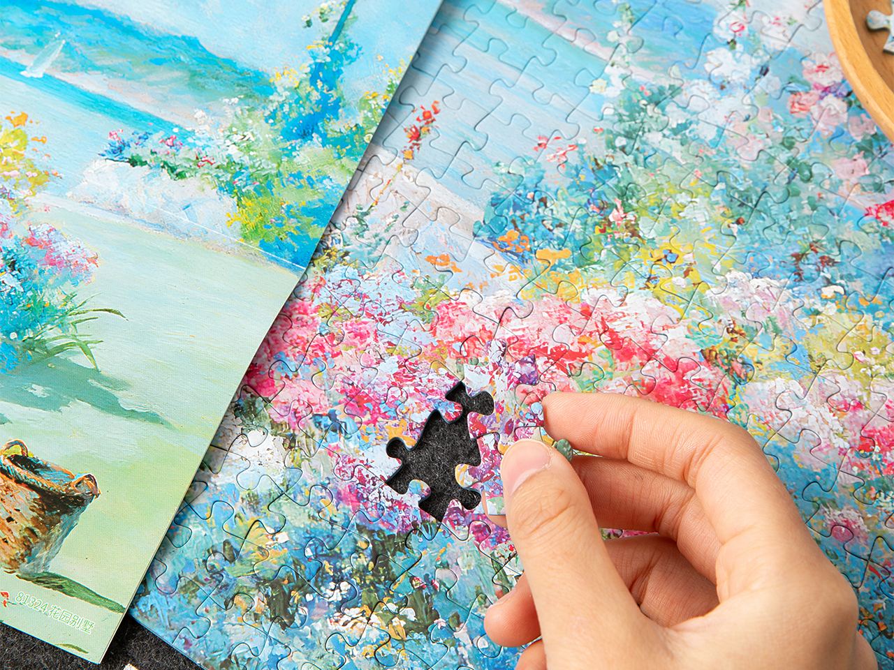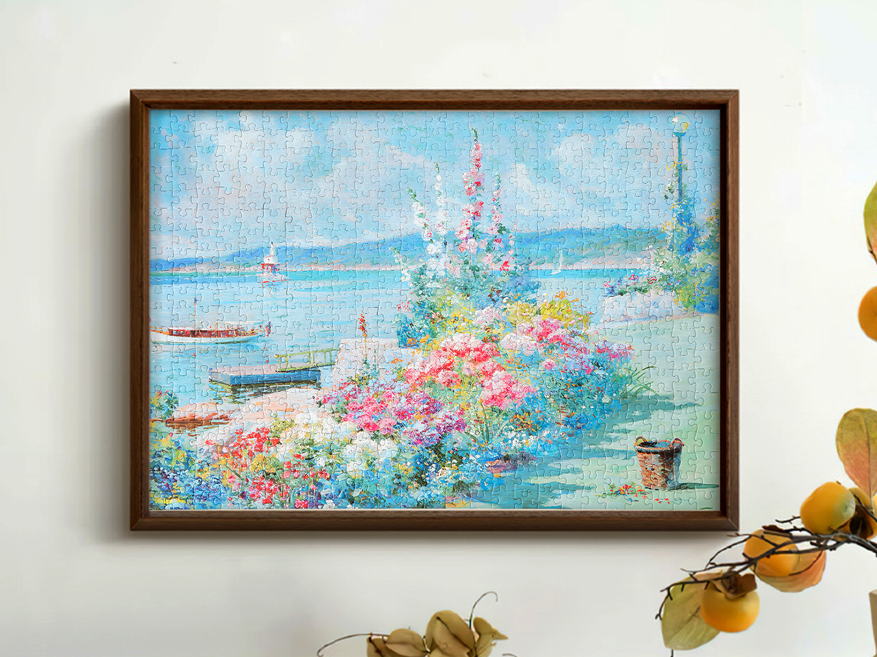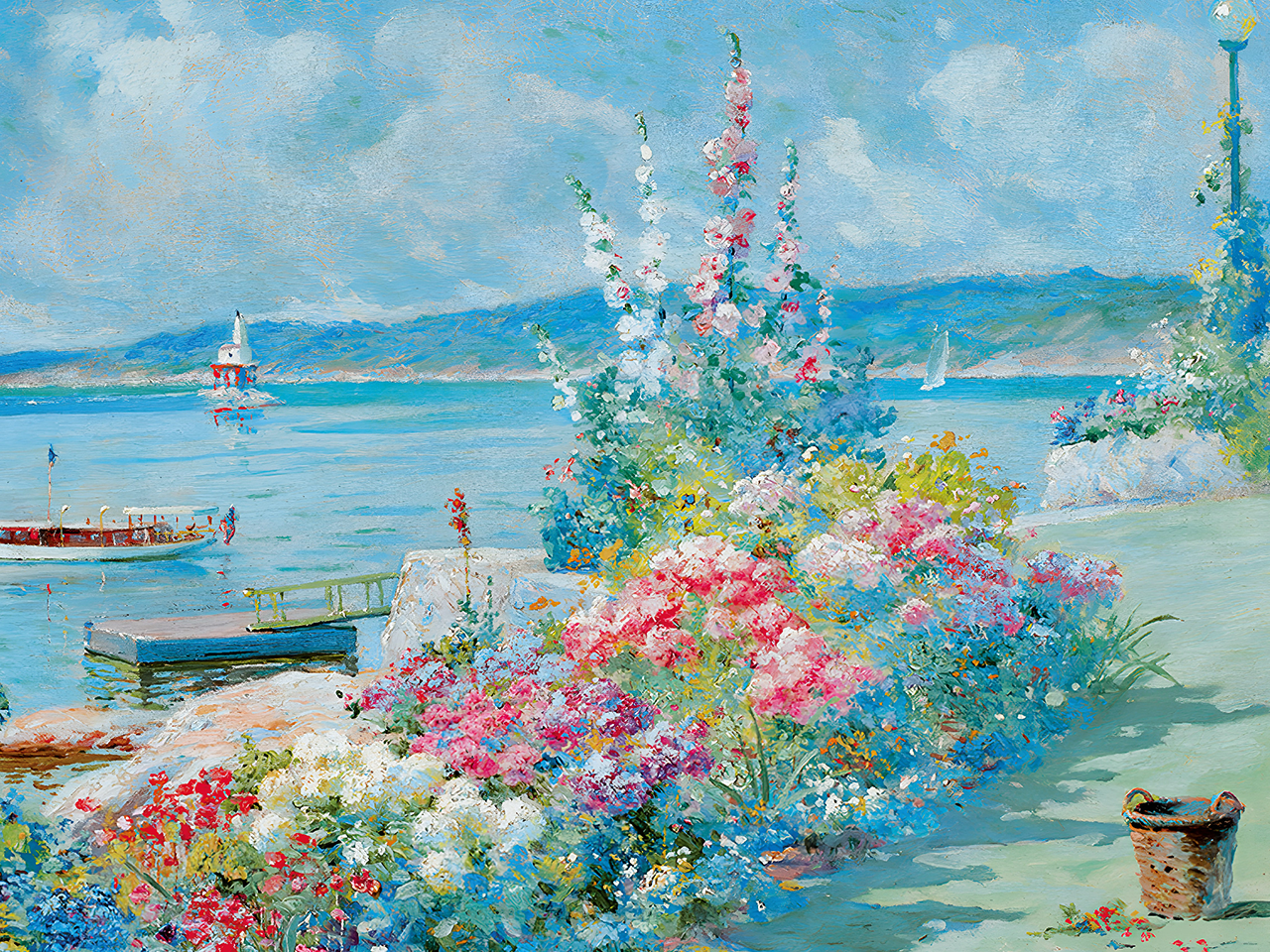 This is a painting with great visual appeal and poetic atmosphere. The picture centers around a deep blue window, with the shutters of the window tightly closed, as if concealing unknown stories within the house. It gives a sense of tranquility and mystery.