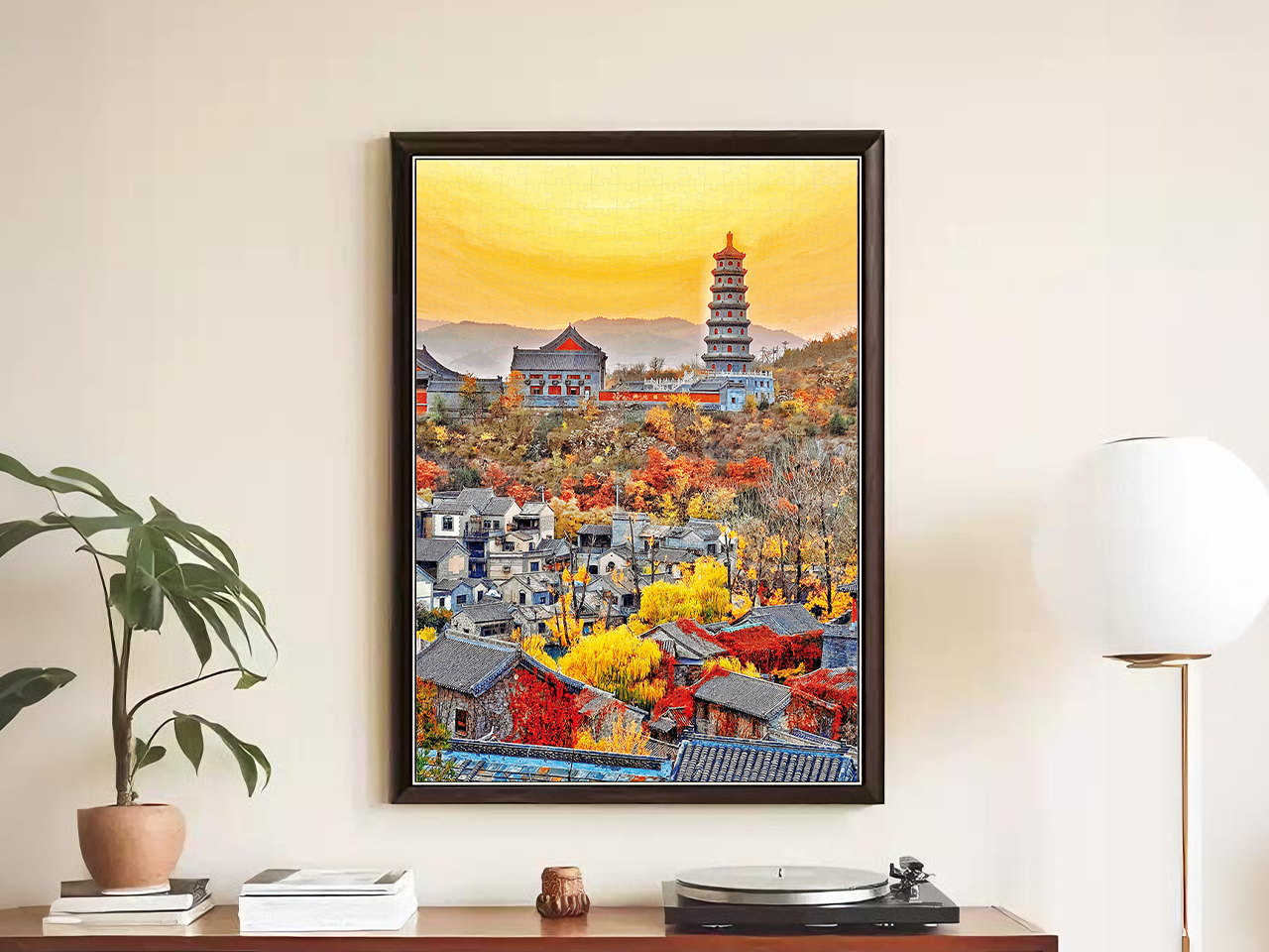 This work slowly unfurls a timeless, poetic autumn scene, like a visible lyrical ancient poem. In the distance, a pagoda stands like a weathered philosopher atop a mist-shrouded mountain peak, bearing the weight of millennia with its rustic simplicity and dignity. Up close, distinctively black and white ancient houses nestle upon the land in harmonious disorder, gently embraced by the vibrant autumn colors covering the hills—red and golden leaves intertwine like fire and gold, forming a picturesque vista. The warm glow of the setting sun cascades like golden gauze, casting a warm filter over every leaf and tile, while light and shadow chorus in hushed tones, as if whispering endless tales of time and bygone eras. This scene is enough to immerse anyone in its serene, breathtaking beauty and traditional philosophical contemplation, making one linger, unwilling to leave.
