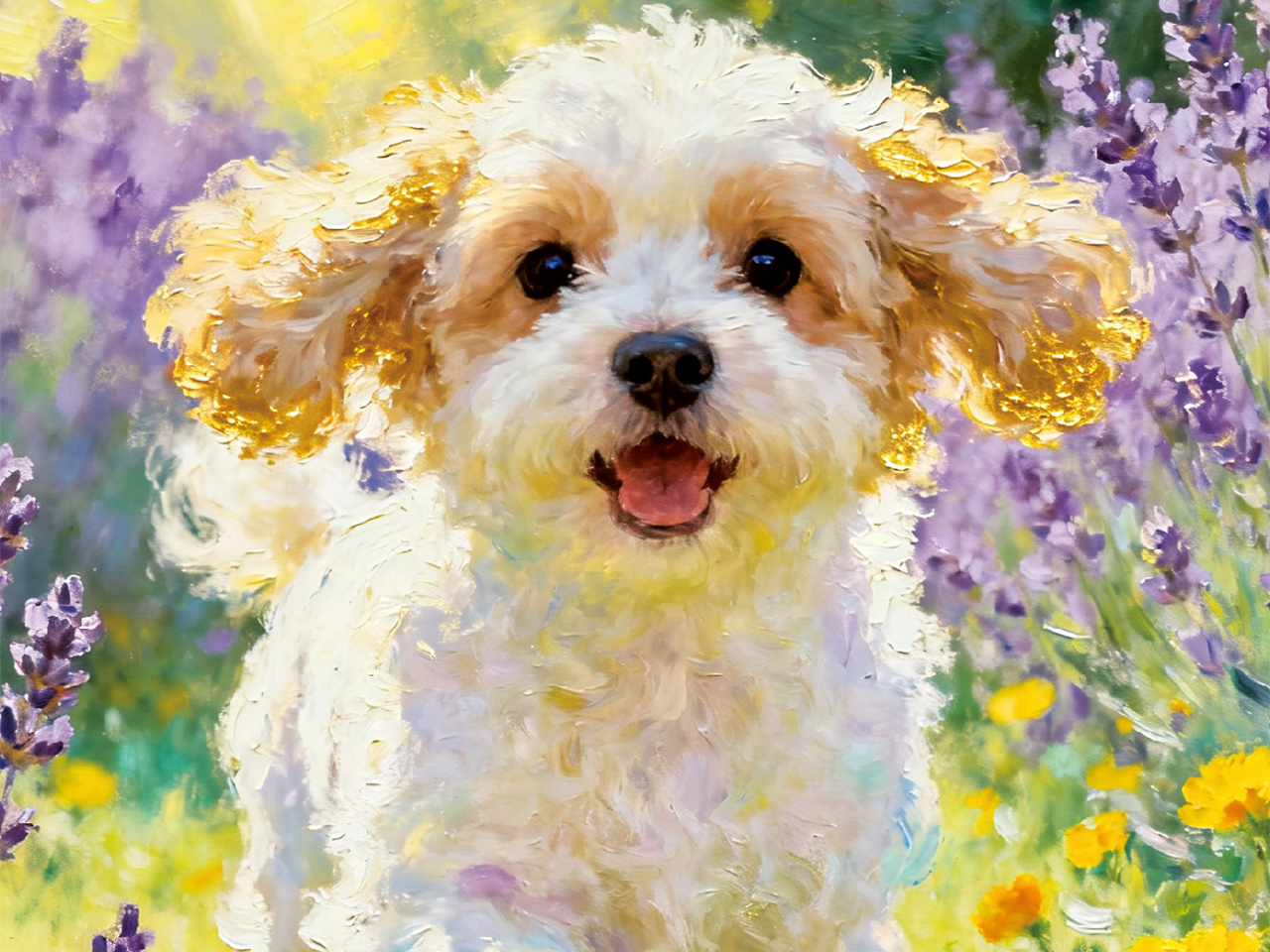 The cute puppy is running energetically with its fluffy fur vividly depicted; the colorful flower beds have bright and lively colors, with natural light and shadow effects; the whole scene exudes the vitality of spring, and is highly decorative and soothing.