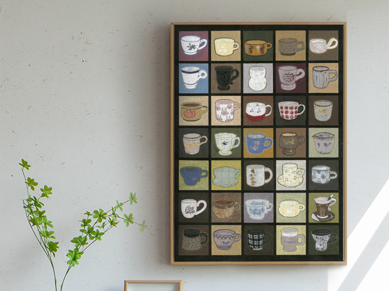 This painting, titled “My Collection,” uniquely showcases a rich and diverse collection of cups. The canvas is divided into neatly arranged squares, each containing a different cup. These cups come in a variety of shapes, including traditional mugs and elegant tea cups with saucers. The colors are vibrant and varied, ranging from pure white and deep black to vibrant blue and warm yellow, among others.