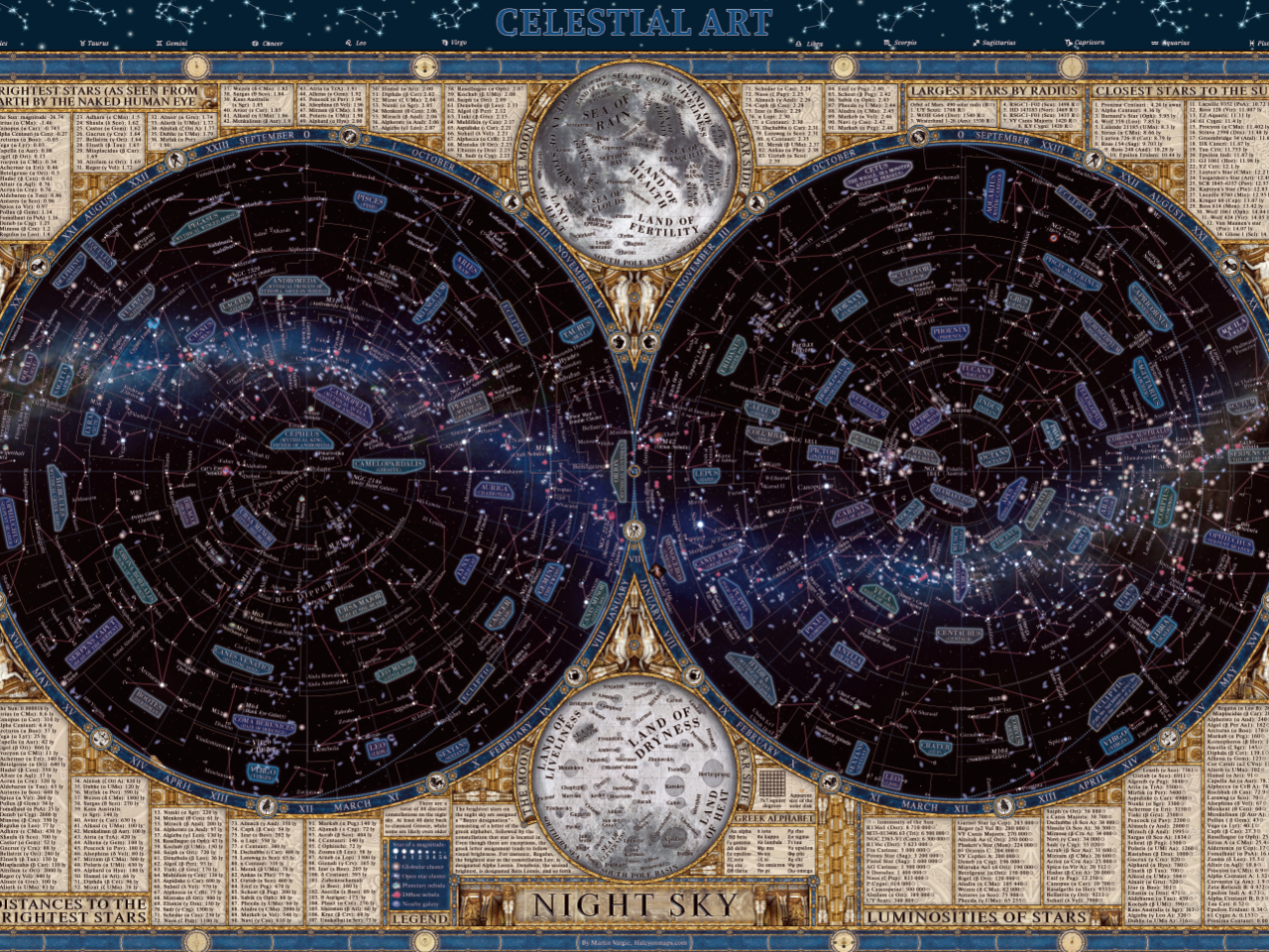 This puzzle features a retro-style magazine illustration, meticulously depicting the night sky of both the northern and southern hemispheres. The image visualises thousands of the brightest stars, galaxies, nebulae, and star clusters from the modern constellation system, each accompanied by English labels and explanations. It also includes maps of the moon's near and far sides, as well as various other astronomical information.