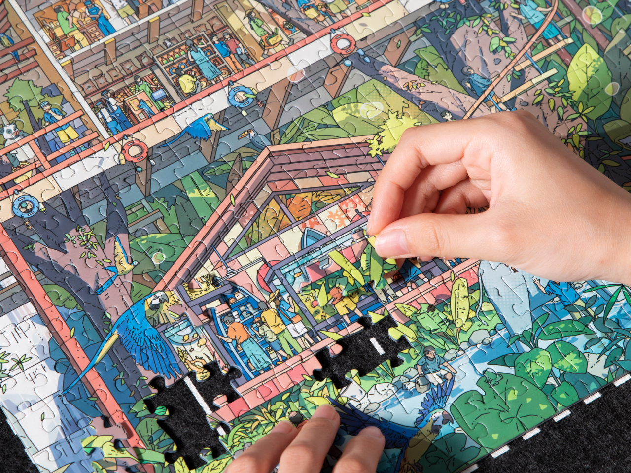 In the sky, colorful parrots flit about, while on the ground, elephants, giraffes, and other animals coexist harmoniously with humans. Waterfall landscapes add a touch of natural charm. People stroll along boardwalks to admire the scenery or play and row boats by the water. Every corner exudes a relaxed and joyful atmosphere, showcasing a magical world where humans and nature are deeply integrated, brimming with vitality and joy. It feels like the utopia urban dwellers long for, with every detail conveying a beautiful vision of freedom and natural living.