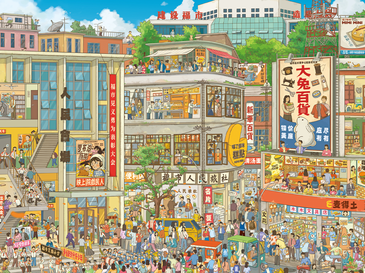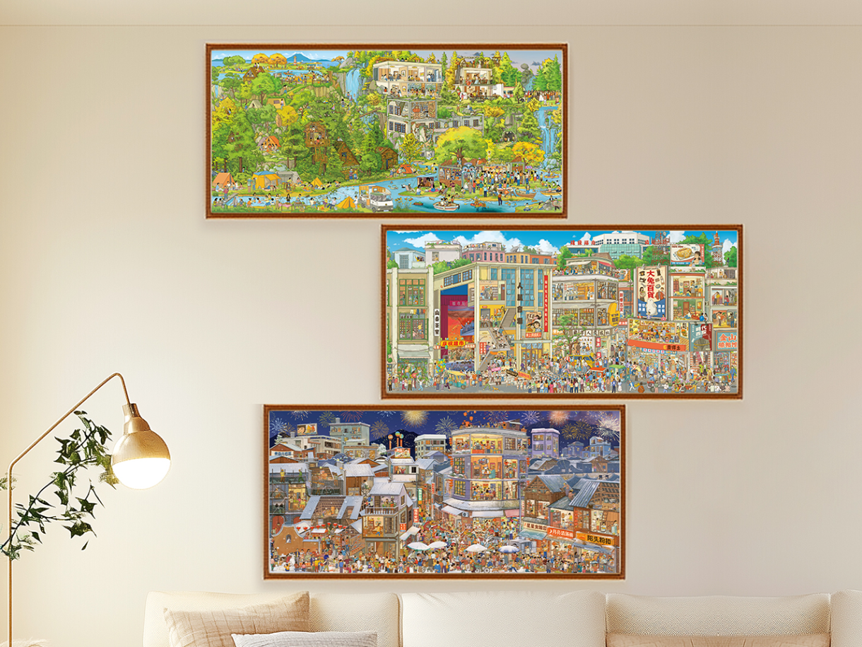 This series of puzzles adopts a retro-nostalgic style, centring on a small town in China during the millennium era, to create a cohesive and vibrant worldview. The first piece depicts autumn camping in a valley, adorned with golden autumn leaves, where campers relax by their tents, enjoy picnics, or admire the scenery, creating a pleasant and leisurely atmosphere; The second piece depicts a gathering on the town's main street, bustling with activity, vibrant shop signs, and people moving about, exuding a lively, everyday charm; The third piece focuses on New Year's Eve in the millennium year, with the town aglow in festive lights, fireworks blooming in the night sky, and people gathering together in joy and celebration.