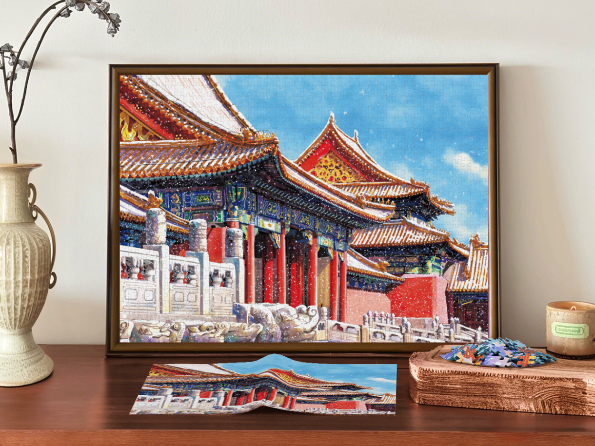 The weathered vermilion walls and the gleaming golden glazed tiles appear all the more solemn, sacred, and ineffably splendid against the pure backdrop of an azure sky and a pristine blanket of white snow. The artist employs exquisitely delicate brushstrokes to meticulously outline the clever structures and traces of time on the upturned eaves and bracket sets; meanwhile, the swirling snowflakes seem enchanted with life, bestowing a sense of dynamic vitality and profound tranquility upon the architectural complex. The colors are both vibrantly captivating and imbued with an antique charm, successfully condensing the majestic grandeur and deep historical accumulation of the Forbidden City within its frame, captivating the heart and mind, and evoking a feeling of being transported to another era.