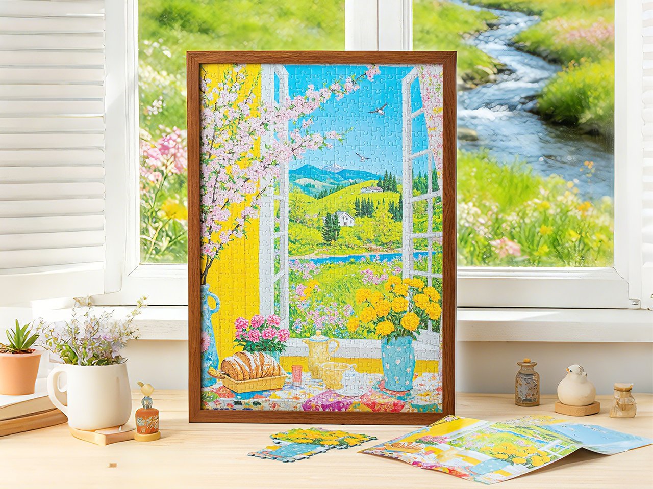 This is an oil painting full of vitality and warmth, depicting a harmonious and beautiful scene both indoors and outdoors. The entire work adopts bright and cheerful tones, with bold brushstrokes that are expressive and full of vitality, featuring a strong impressionist style. The picture perfectly combines the warm tranquility of the interior with the natural beauty of the outside, conveying a peaceful and comfortable living atmosphere, allowing people to feel the beauty of nature and the leisure of life.